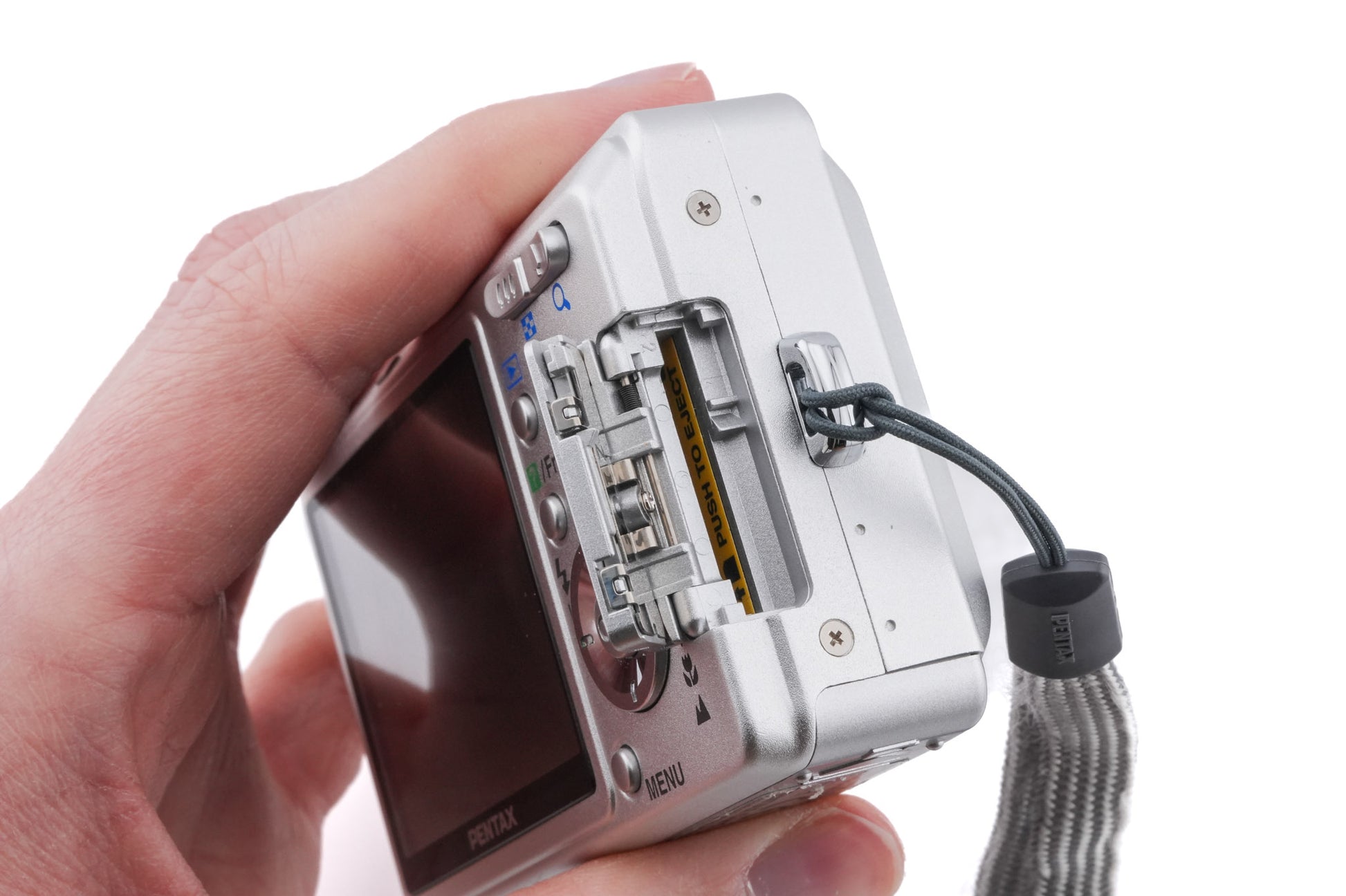 Autofocus digital point-and-shoot camera made by Pentax in 2005. Plastic body available in silver.
