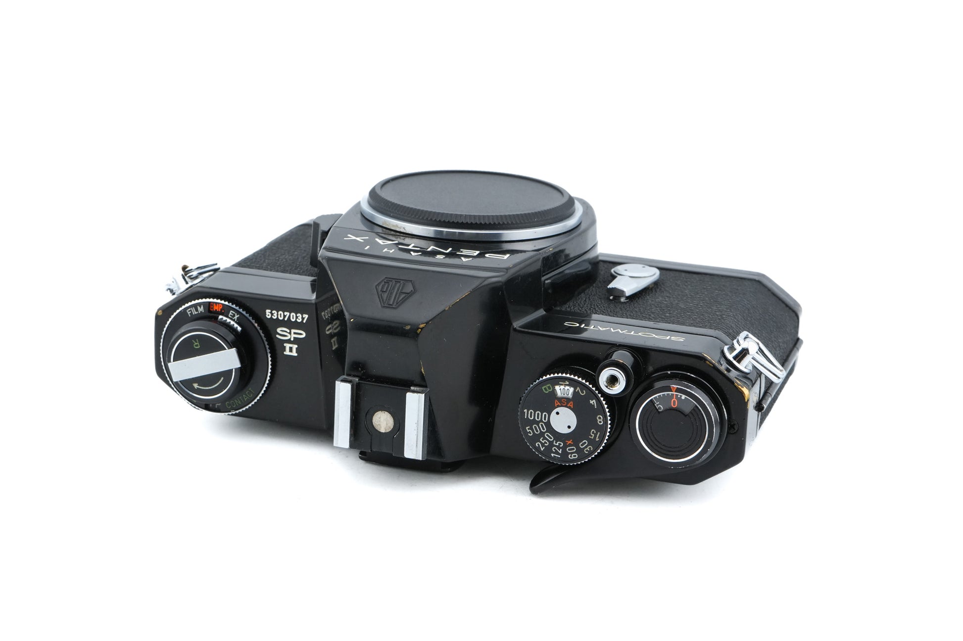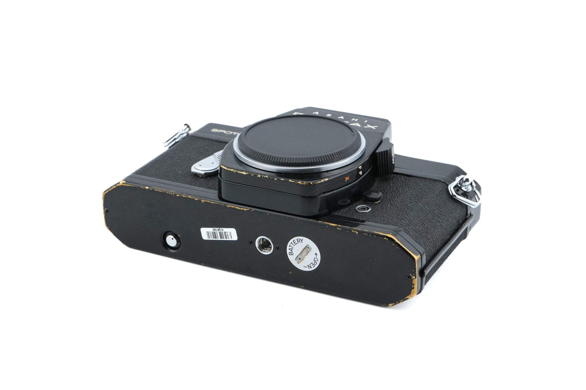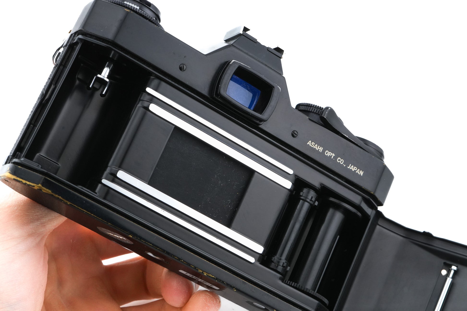 Manual focus M42 mount 35mm SLR camera released by Asahi Pentax in 1971. This camera was released alongside the SMC line of lenses and was the first Spotmatic to include a hot shoe for flash. It was made to use a 1.3V PX-400 mercury battery for the light meter. Metal body available in black & silver.