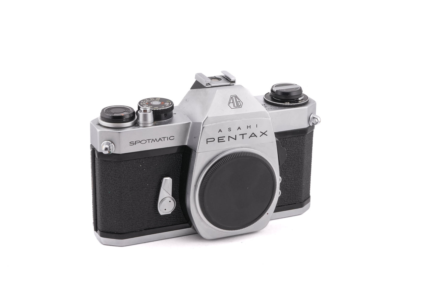 Manual focus M42 mount 35mm SLR camera released by Asahi Pentax in 1971. This camera was released alongside the SMC line of lenses and was the first Spotmatic to include a hot shoe for flash. It was made to use a 1.3V PX-400 mercury battery for the light meter. Metal body available in black & silver.