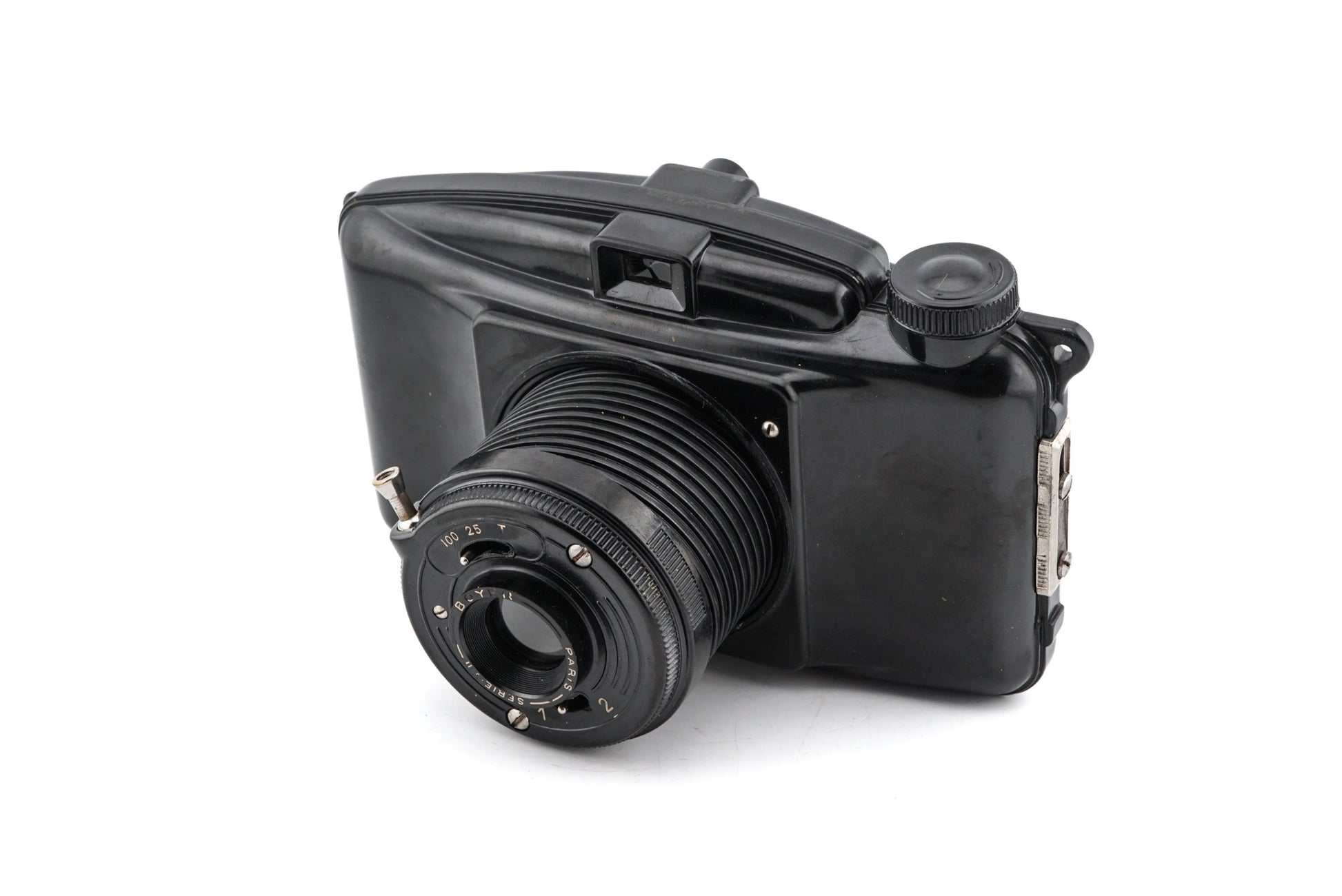 Fixed focus extending lens viewfinder camera released by Photax. Bakelite body available in black.