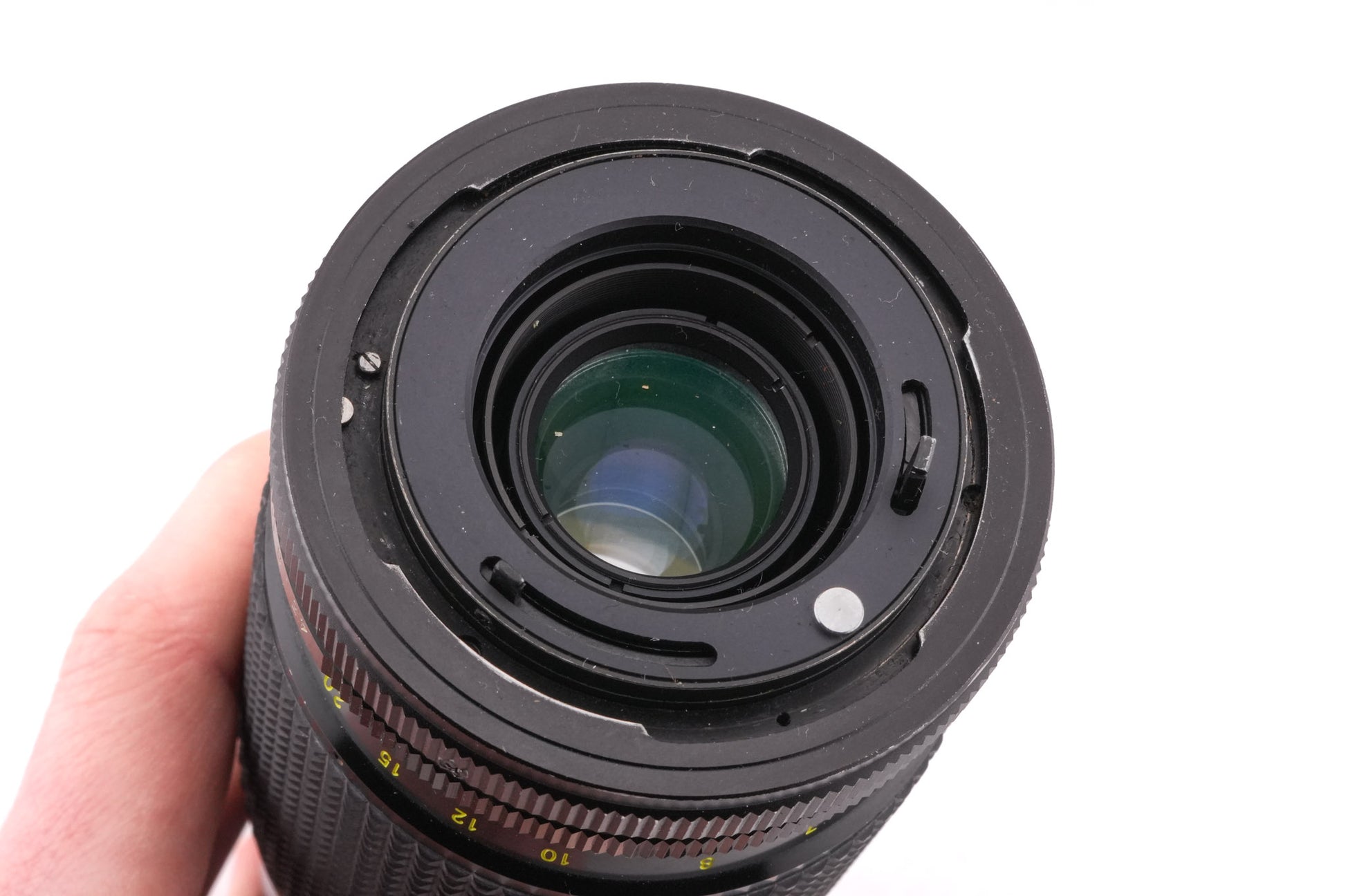 Manual focus telephoto push/pull zoom lens made for FD-mount 35mm SLR cameras introduced by Promura. Metal and plastic body available in black.