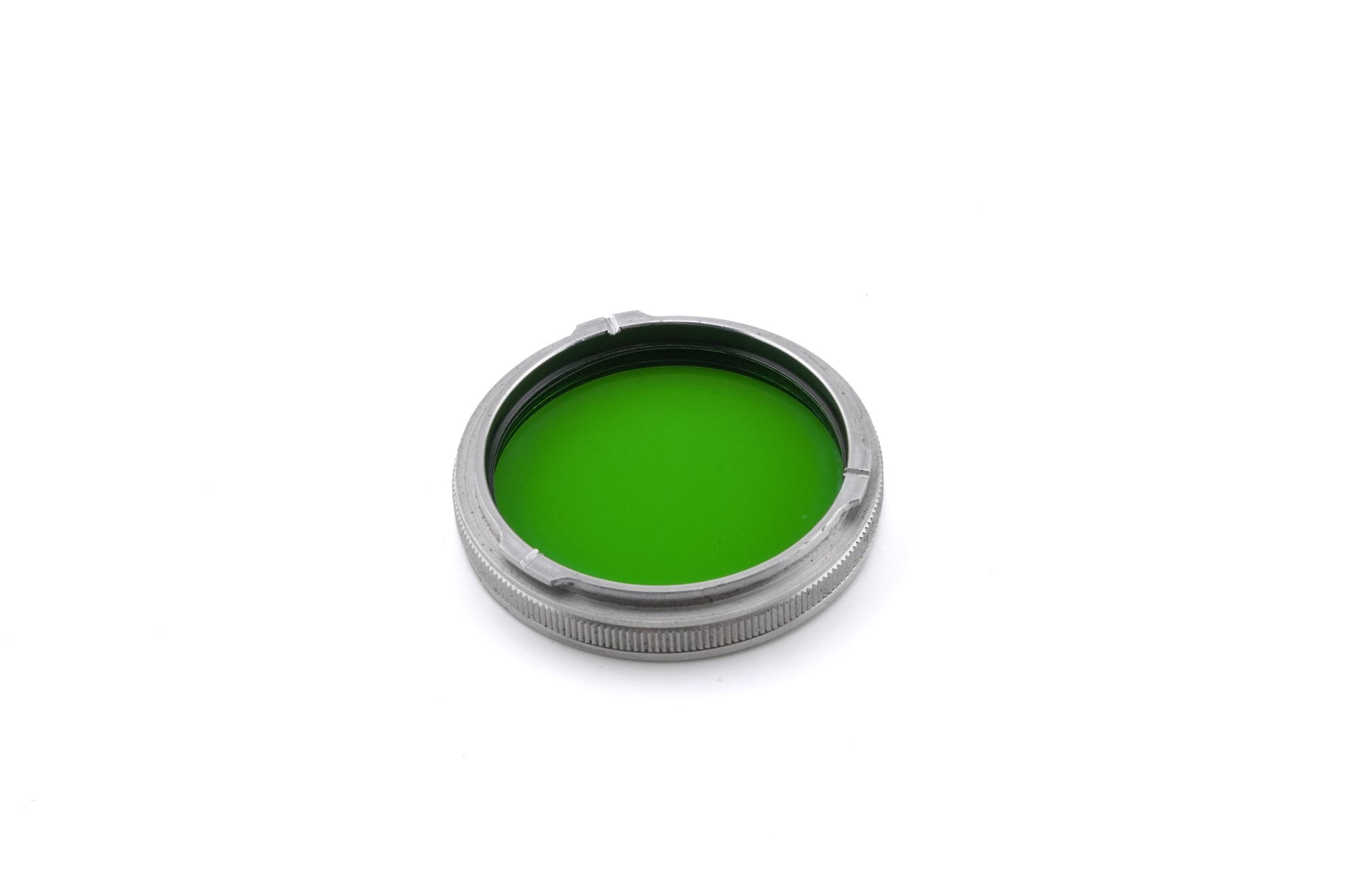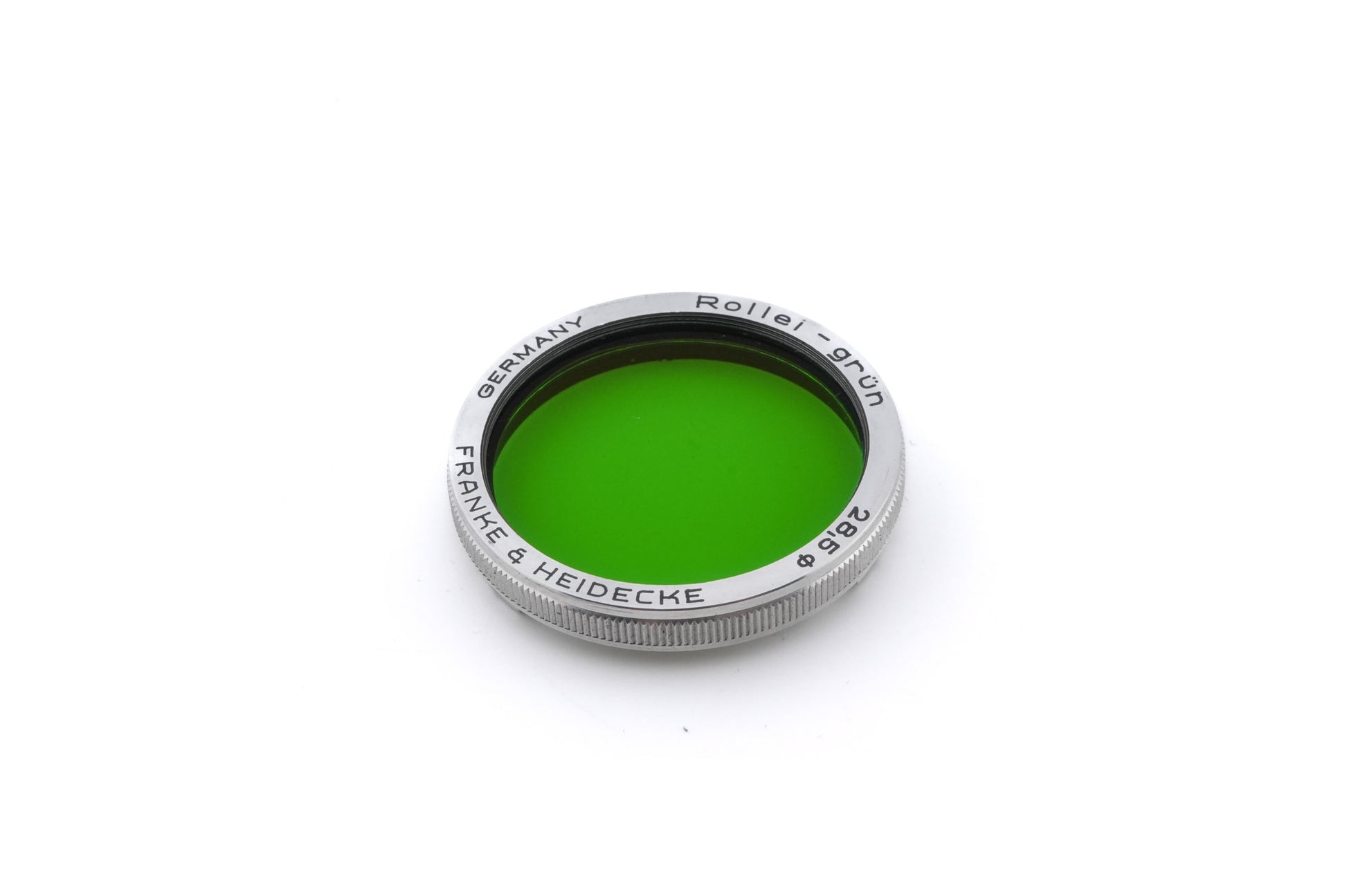 Green filter made by Rollei with bayonet I filter mount. Lighten dark greens making the image look more natural. Chrome metal body.