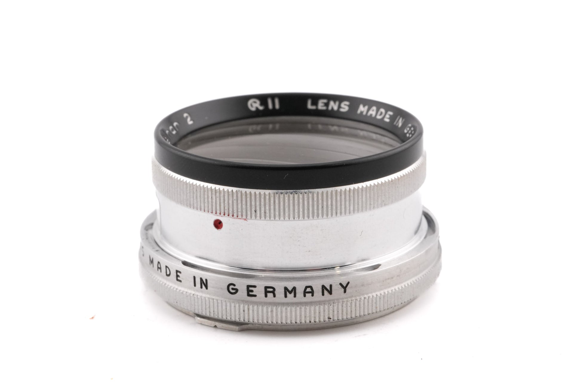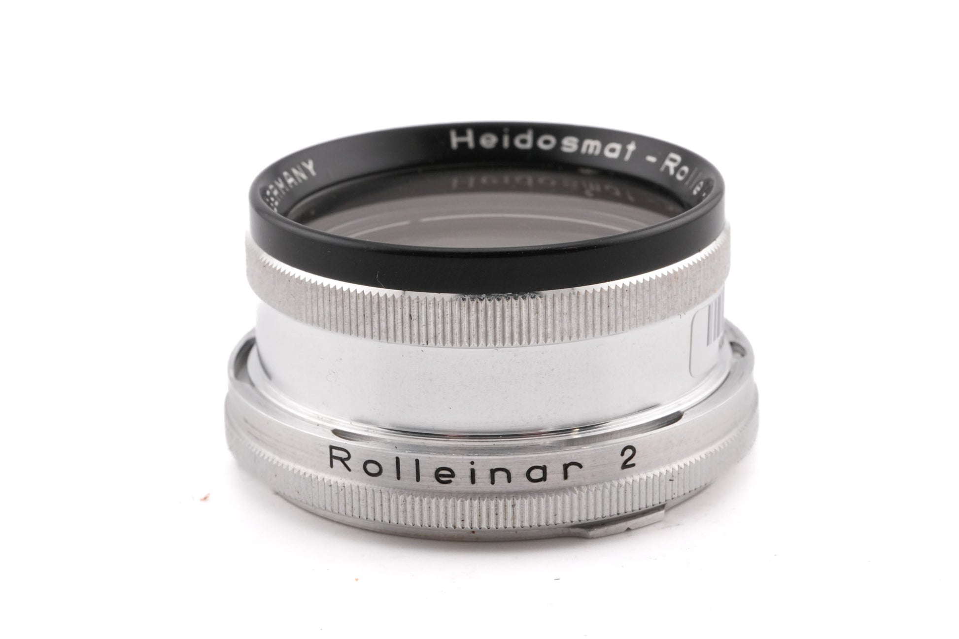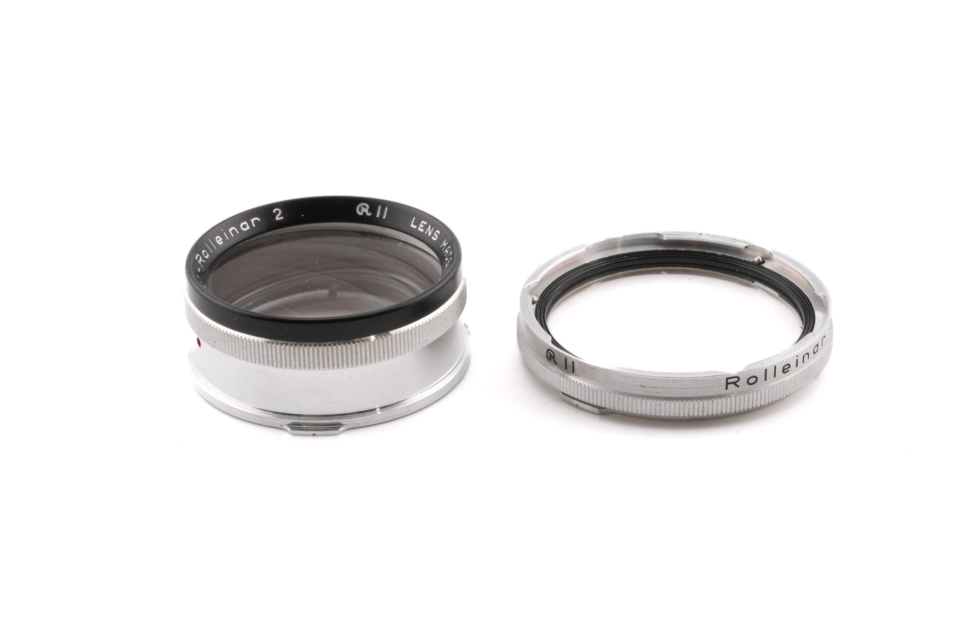 Set of close-up lenses made by Rollei for TLRs with Bay 2 accessory bayonets. The larger Heidosmat-Rolleinar is for the viewing lens and includes a prism to correct for parallax error. The smaller Rolleinar is for the taking lens and enhances close focus abilities, allowing for focus between 32 and 50cm.