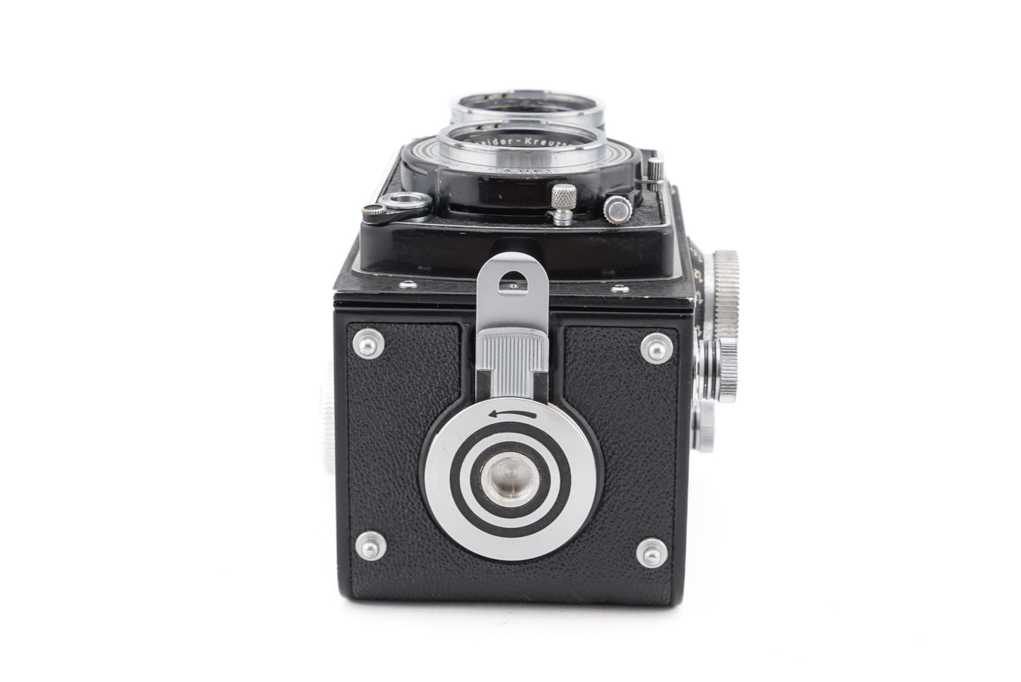 Manual focus medium format TLR released by Rollei in 1957. This is the older version, with shutter speeds on one side and EV/aperture values on the other. Metal body available in black.