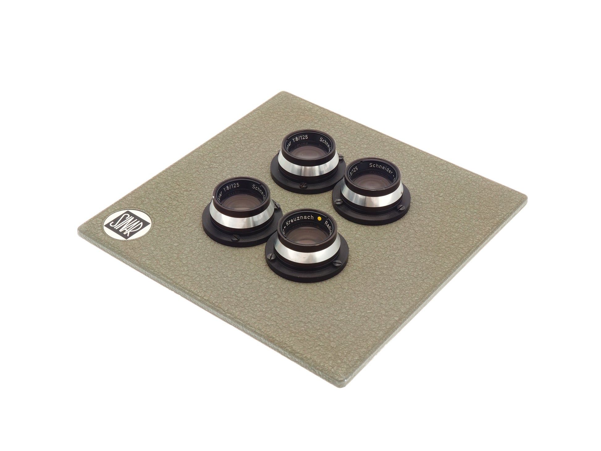 Lens board with four lenses made by Schneider-Kreuznach for taking passport photos. They have a fixed f8 aperture. Metal body available in black.