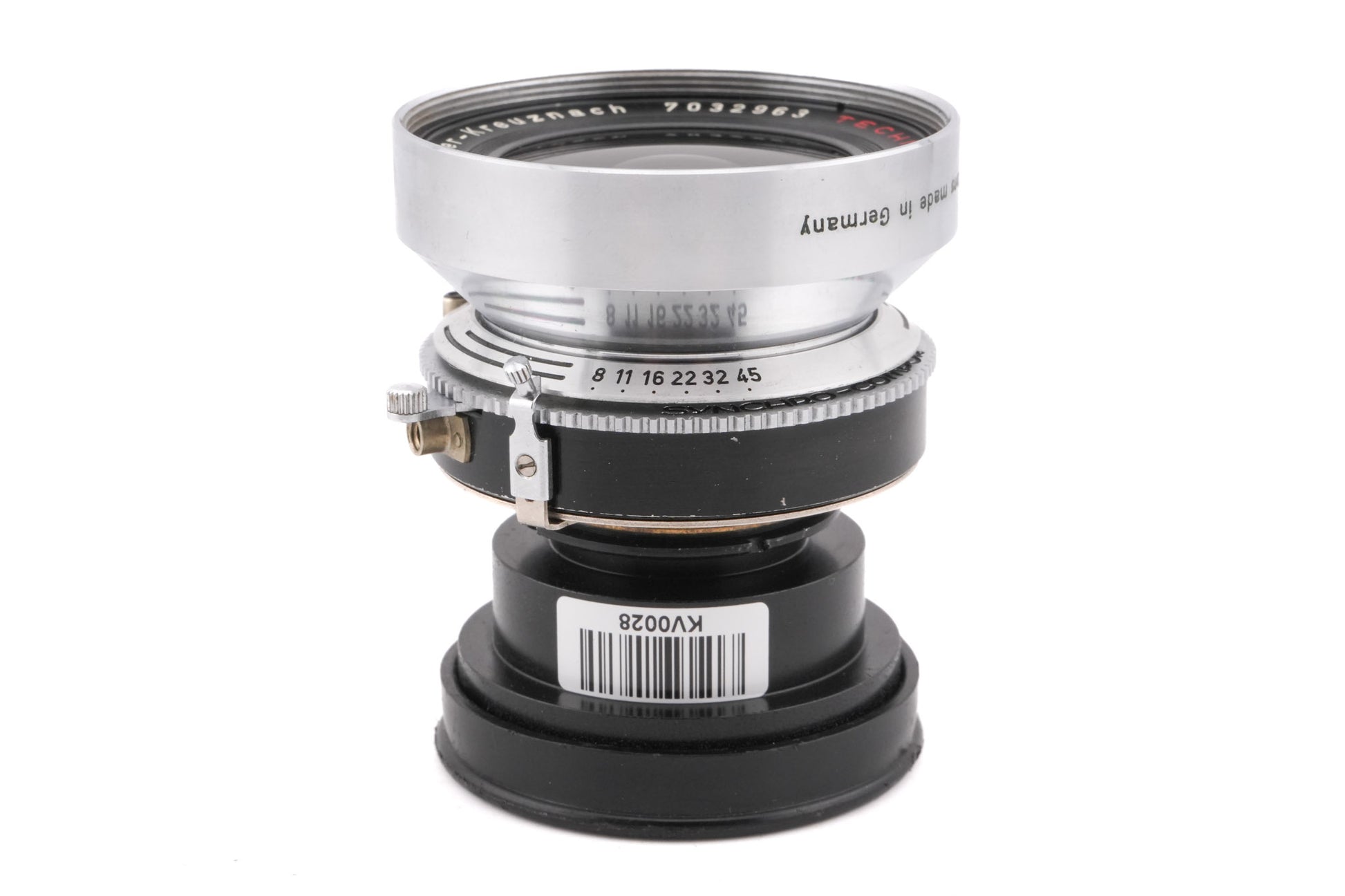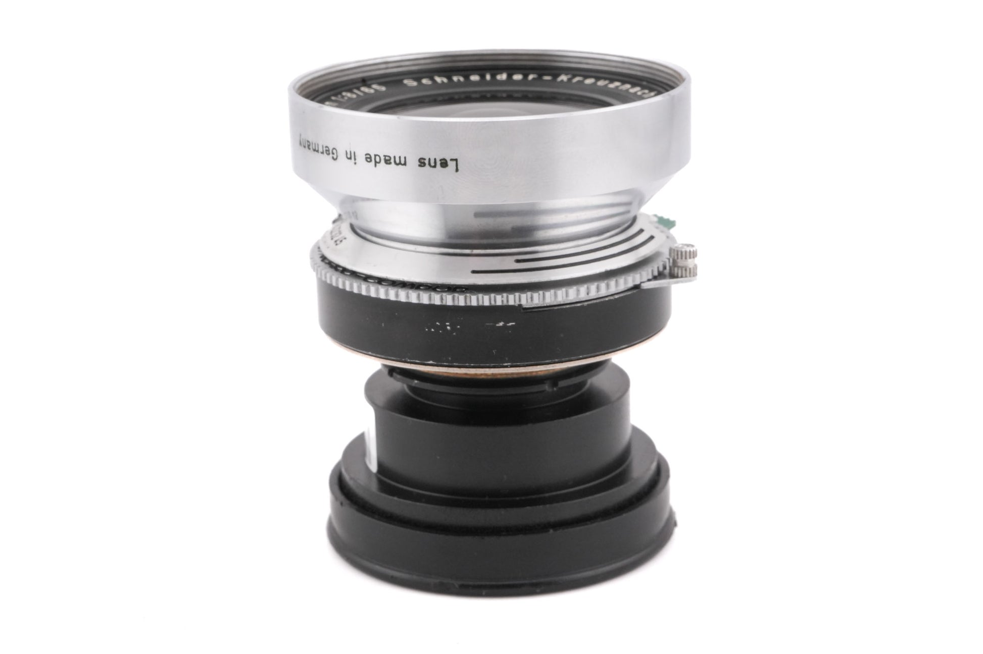 Wide angle lens made for large format systems by Schneider-Kreuznach. It gives the equivalent field of view to a 22mm lens on full frame/35mm (when mounted on 4x5). Metal body available in black.