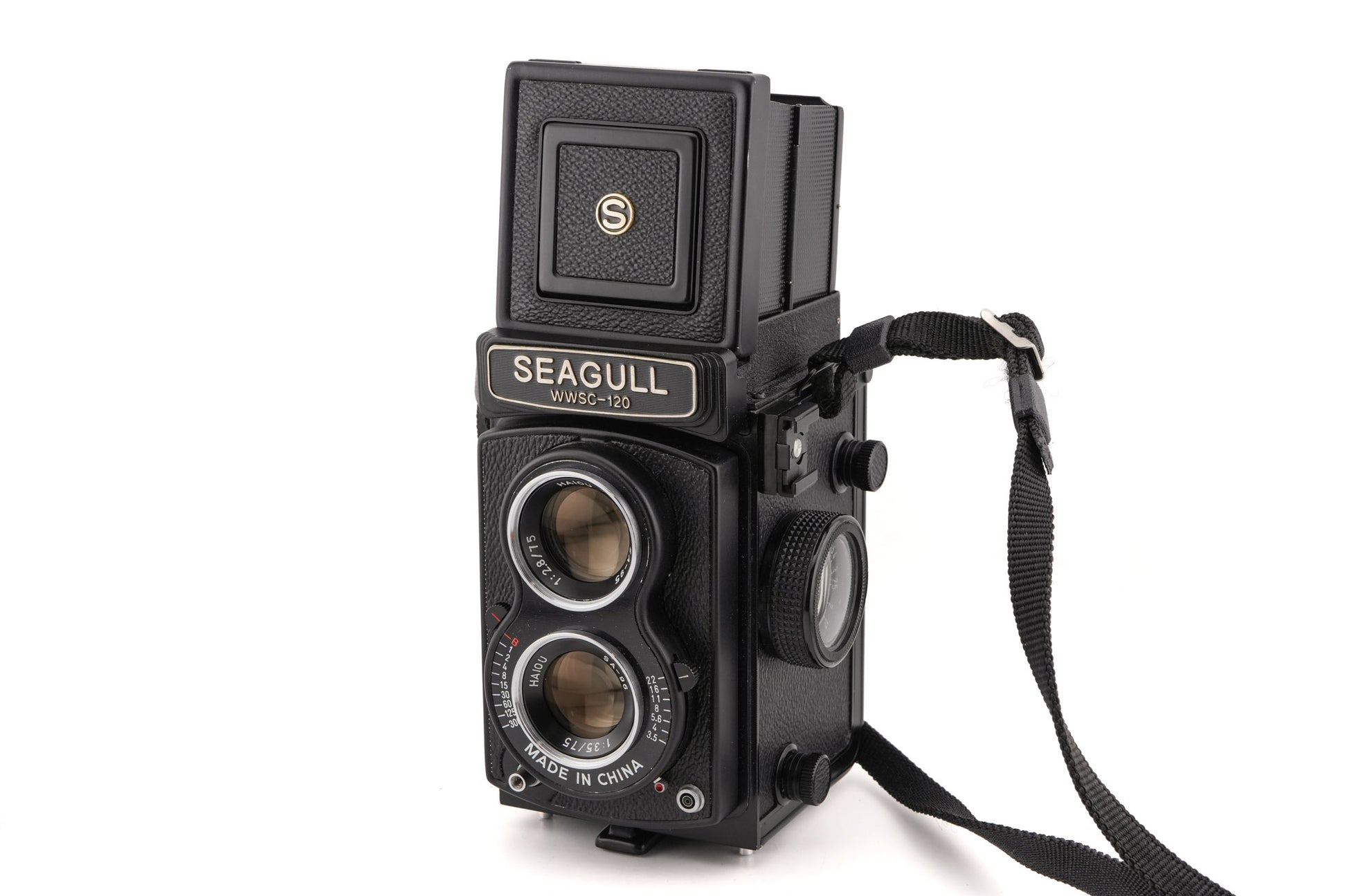 Manual focus 120 6x6 TLR camera made by Seagull. Metal and plastic body available in black.