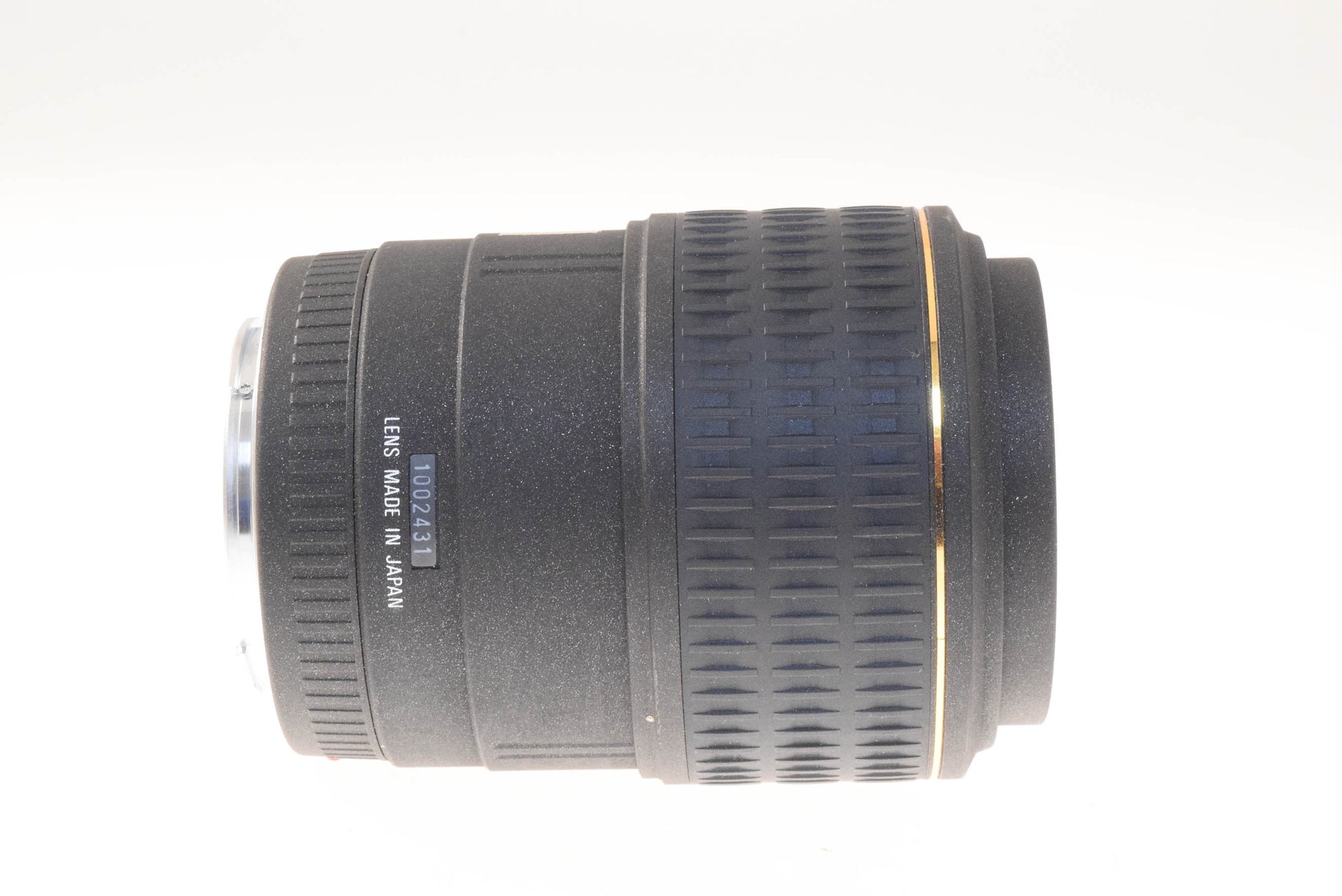 Short Sigma telephoto lens with macro feature. The lens is capable of 1:1 magnification ratio. Other features include a focus limiter switch.