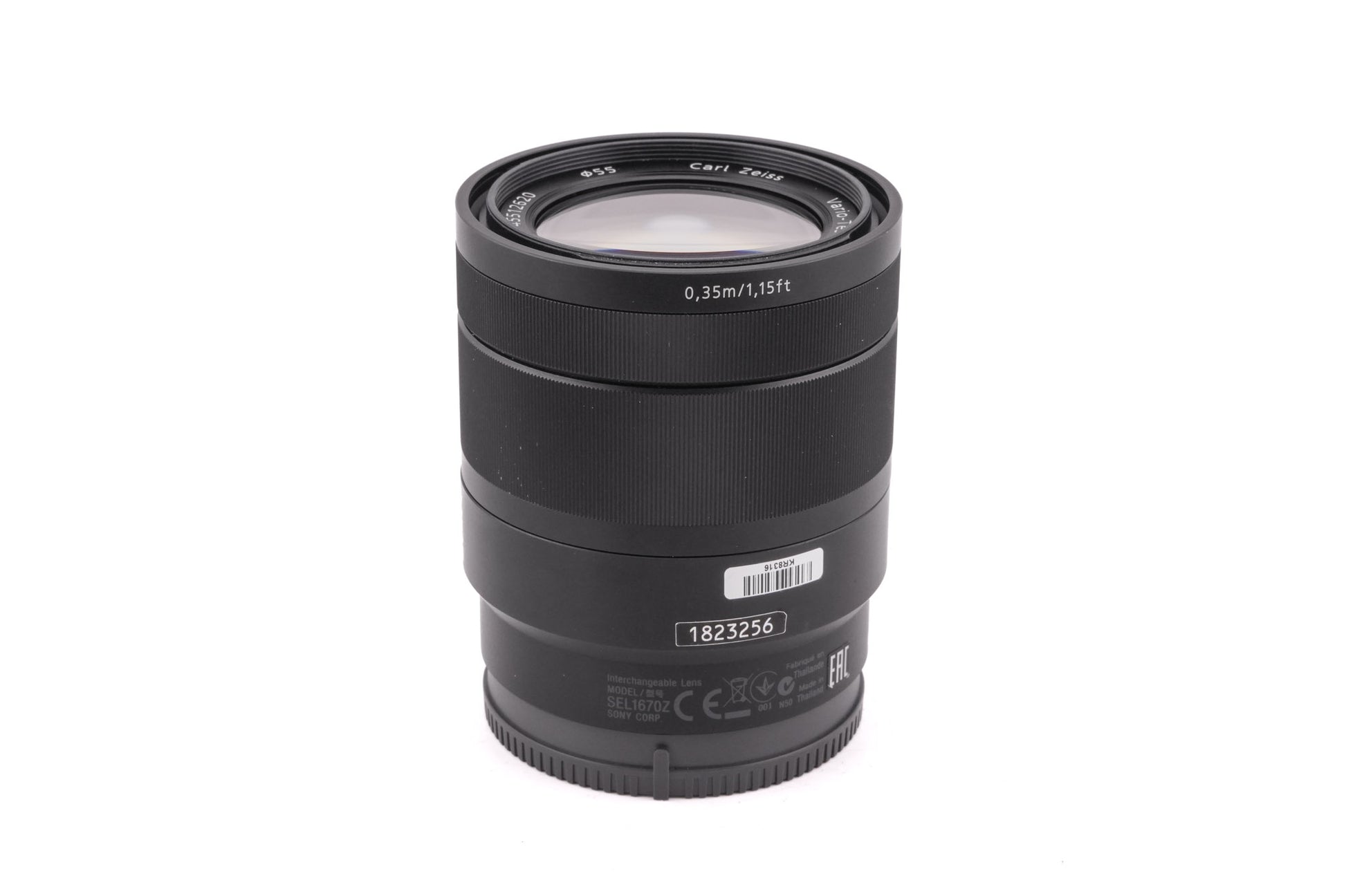 Autofocus normal zoom lens made for E-mount digital mirrorless cameras by Carl Zeiss starting in 2013. It is designed for APS-C-sized sensors and gives the equivalent field of view to a 24-105mm lens on full frame/35mm. It has image stabilization (OSS). The product code is SEL1670Z. Metal and plastic body available in black.