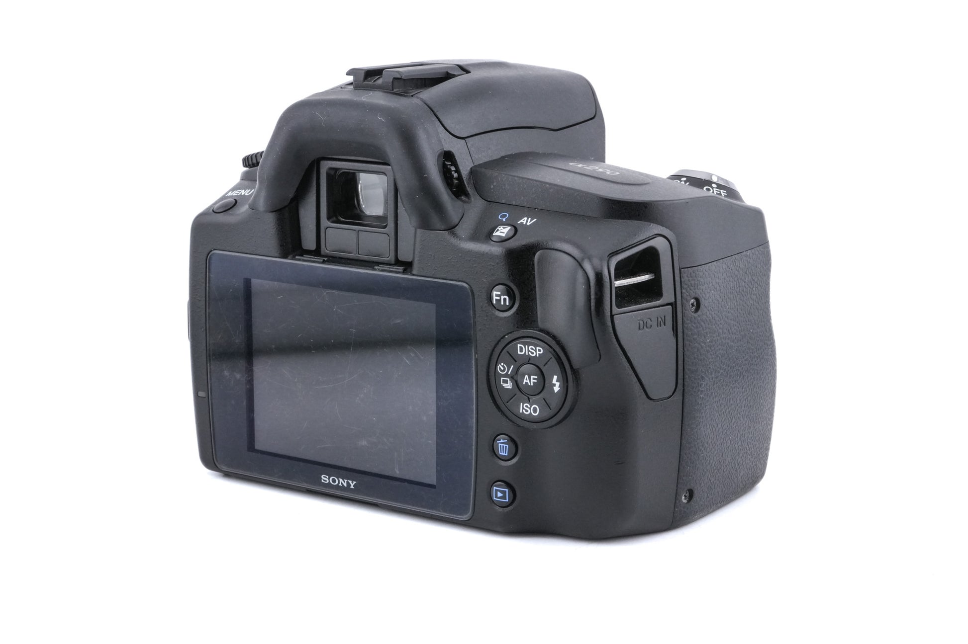 Autofocus APS-C DSLR camera released by Sony in 2010. Uses Memory Sticks or SD cards for storage. Has a built-in pop-up flash and a 2.7″ LCD screen. Plastic body available in black.