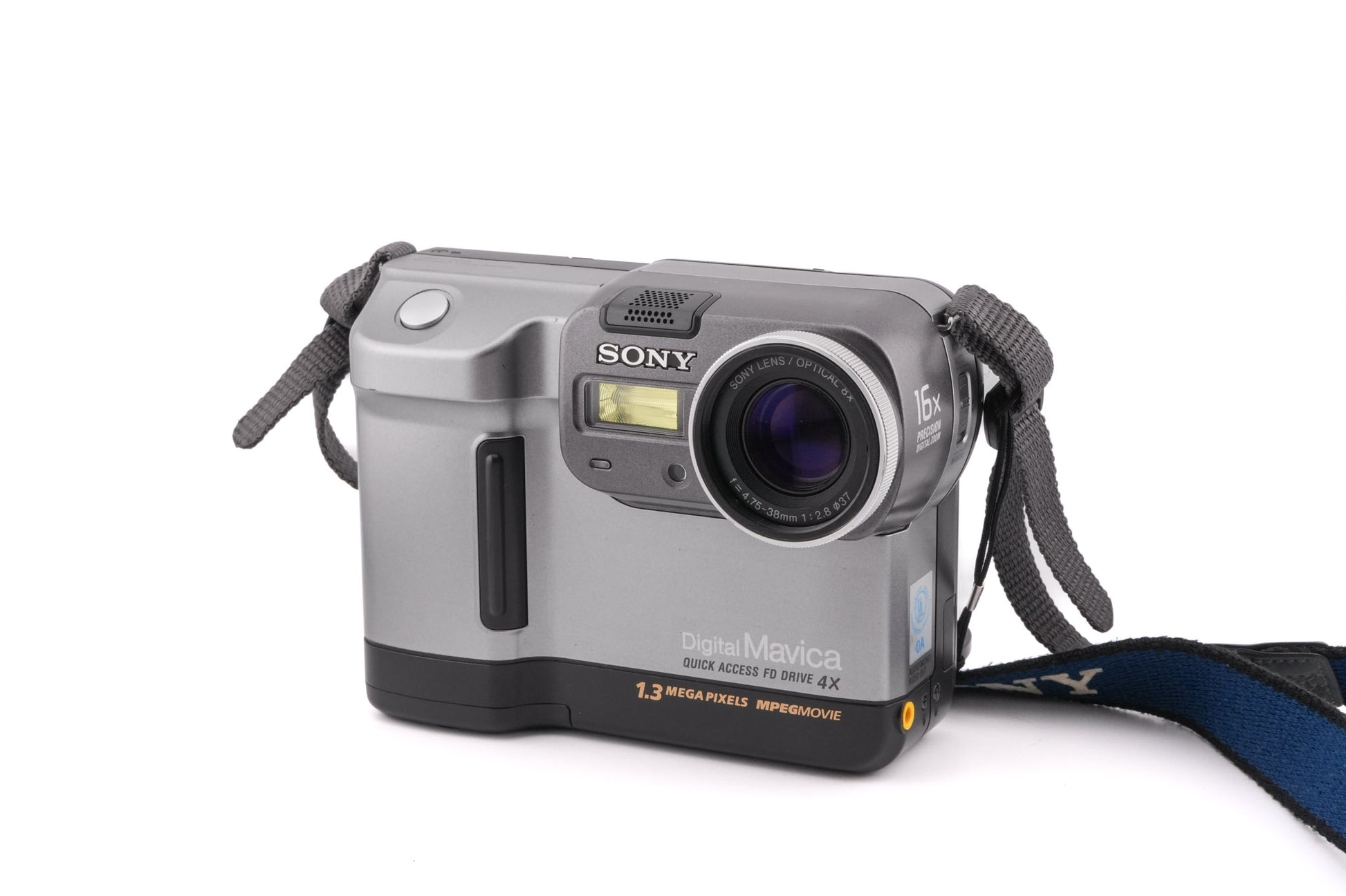 Autofocus digital camera introduced by Sony in 1999. It uses floppy disks as storage. It has a 34 - 400mm equivalent focal length, a 2.5" rear LCD, and a built-in flash. Plastic body available in grey.