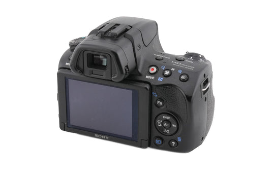 Autofocus A-mount digital SLR camera released by Sony in 2012. It has a built-in flash, a 2.6″ tilting rear LCD, and can record 1080p video. Plastic body available in black.
