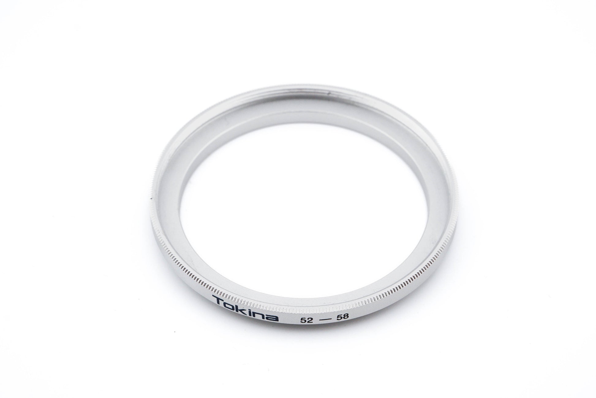 52mm - 58mm step-up ring made by Tokina. Metal construction in silver.
