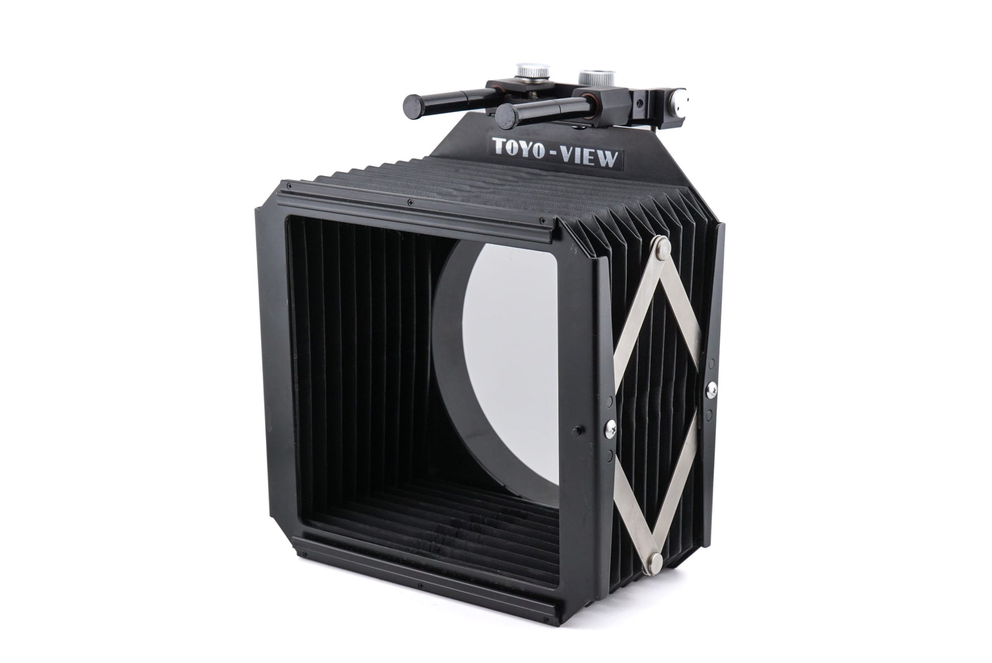 Extendable bellows hood made by Toyo for large format Toya field cameras. It has a slot of gelatin filters. Metal body available in black.