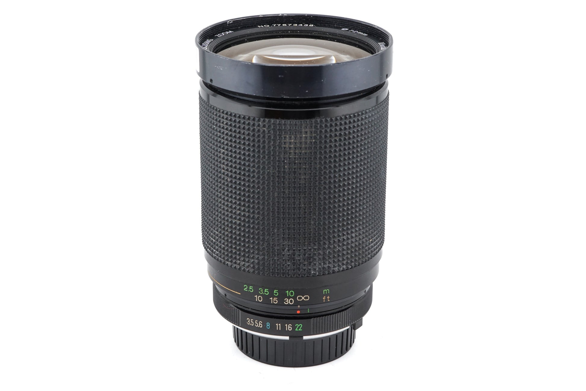 Manual focus superzoom lens made for Minolta MD/SR mount SLR cameras by Vivitar. It's capable of 1:4 macro reproduction. Metal body available in black.
