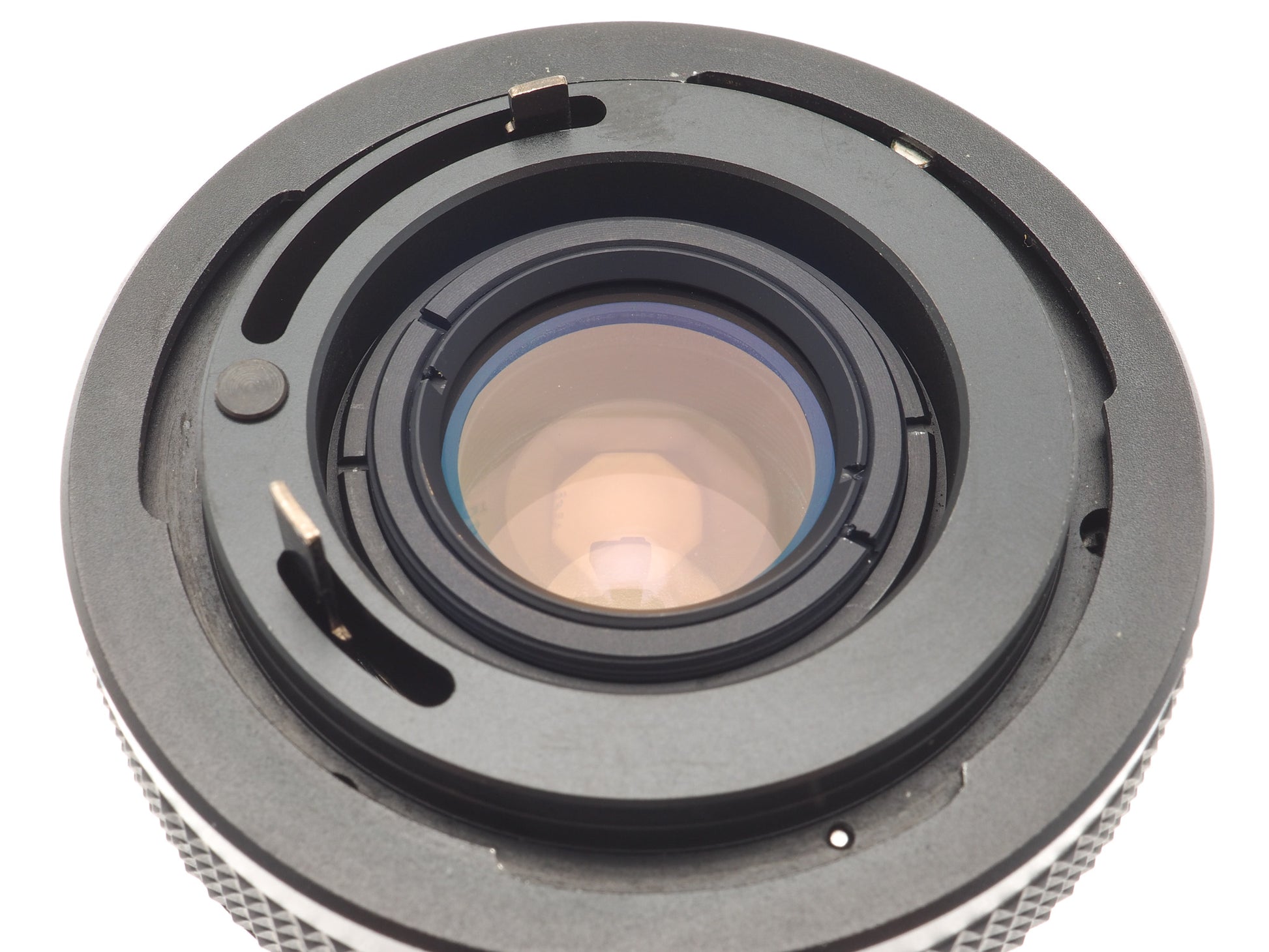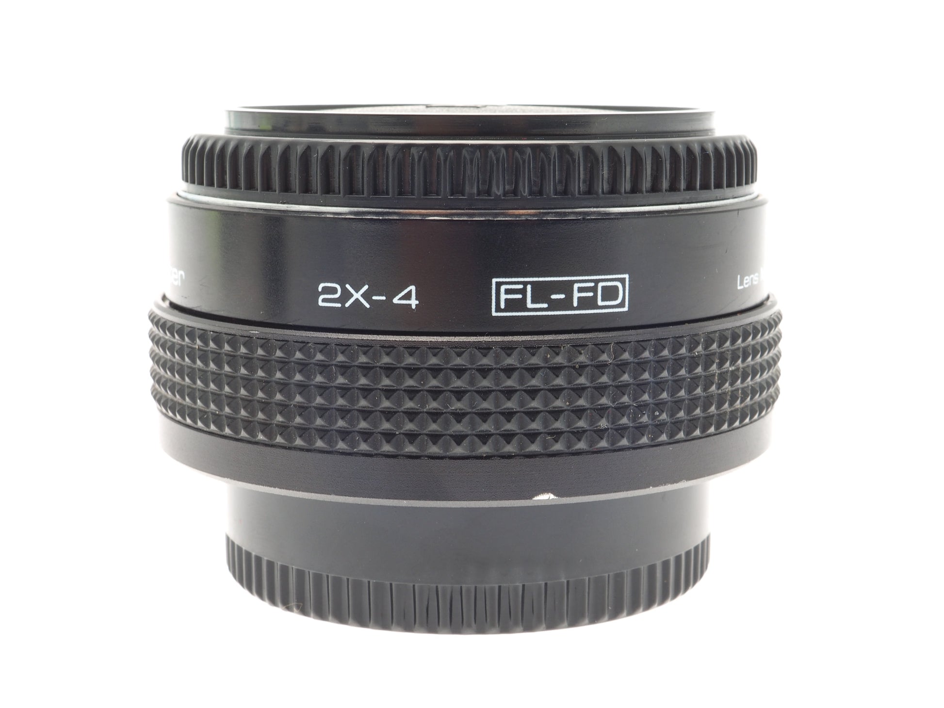 2x teleconverter for Canon FD and FL system. Uses the older breech-lock style of mounting mechanism. Made of black and silver metal.