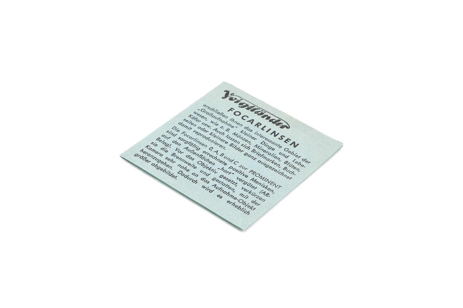 Close-up push-on filter for 100mm f5.5 Telomar made by Voigtländer. Reduces the minimum focusing distance from 2m to 1m. Metal construction available in silver.