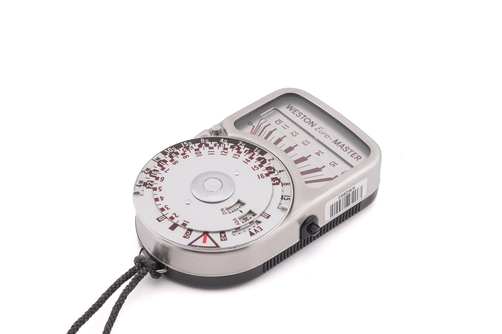 Handheld exposure meter made by Weston. Metal and bakelite body aivalble in silver.