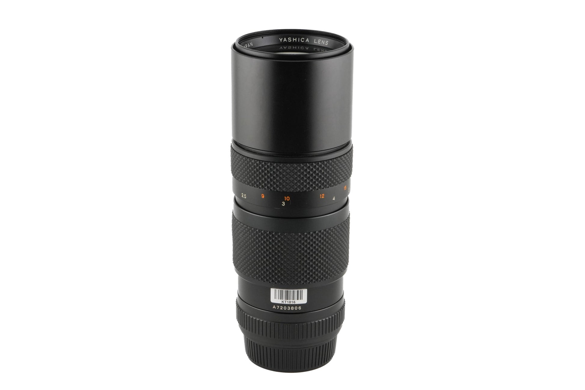Manual focus telephoto zoom lens made for Contax/Yashica mount SLR cameras by Yashica. Has a built-in lens hood. Metal body available in black.