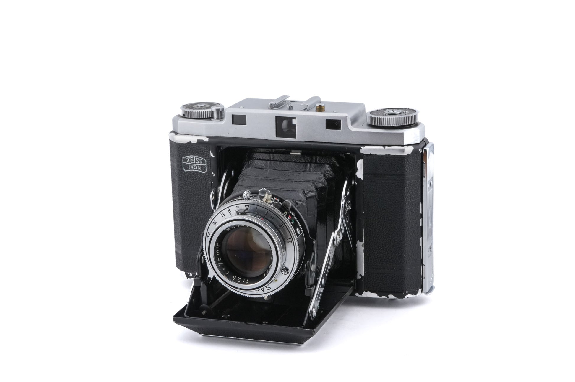 Manual focus 120 folding rangefinder camera released by Zeiss Ikon in 1951. It has an uncoupled rangefinder and a double exposure prevention mechanism. Verious combinations of lens and shutter were available. Metal body available in silver.
