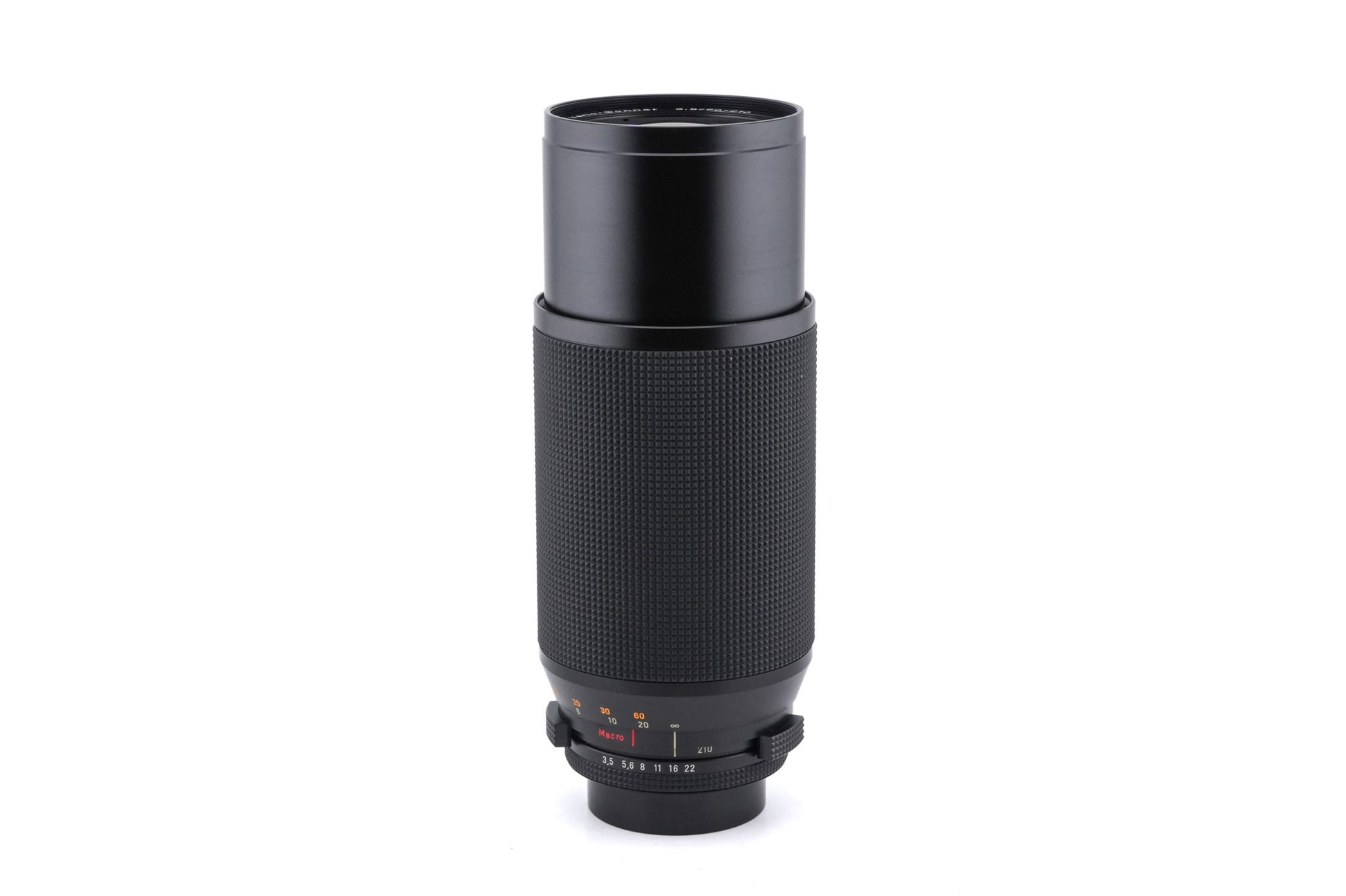 Manual focus telephoto push-pull zoom lens made for Contax/Yashica mount 35mm SLR cameras introduced by Carl Zeiss in 1980. This lens is of the older AE variant with “ninja star” bokeh and no support for shutter priority or program modes. Metal body available in black.