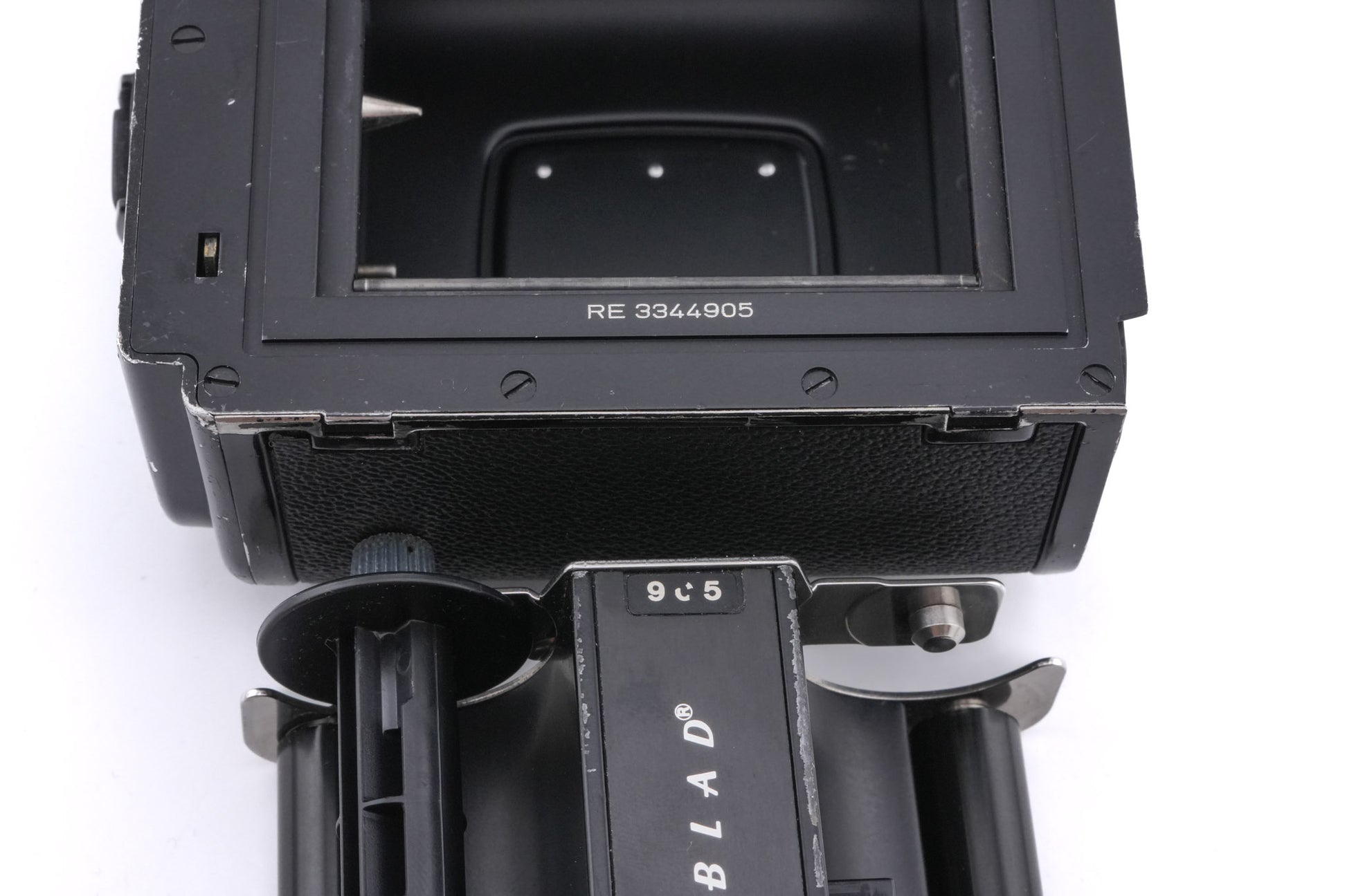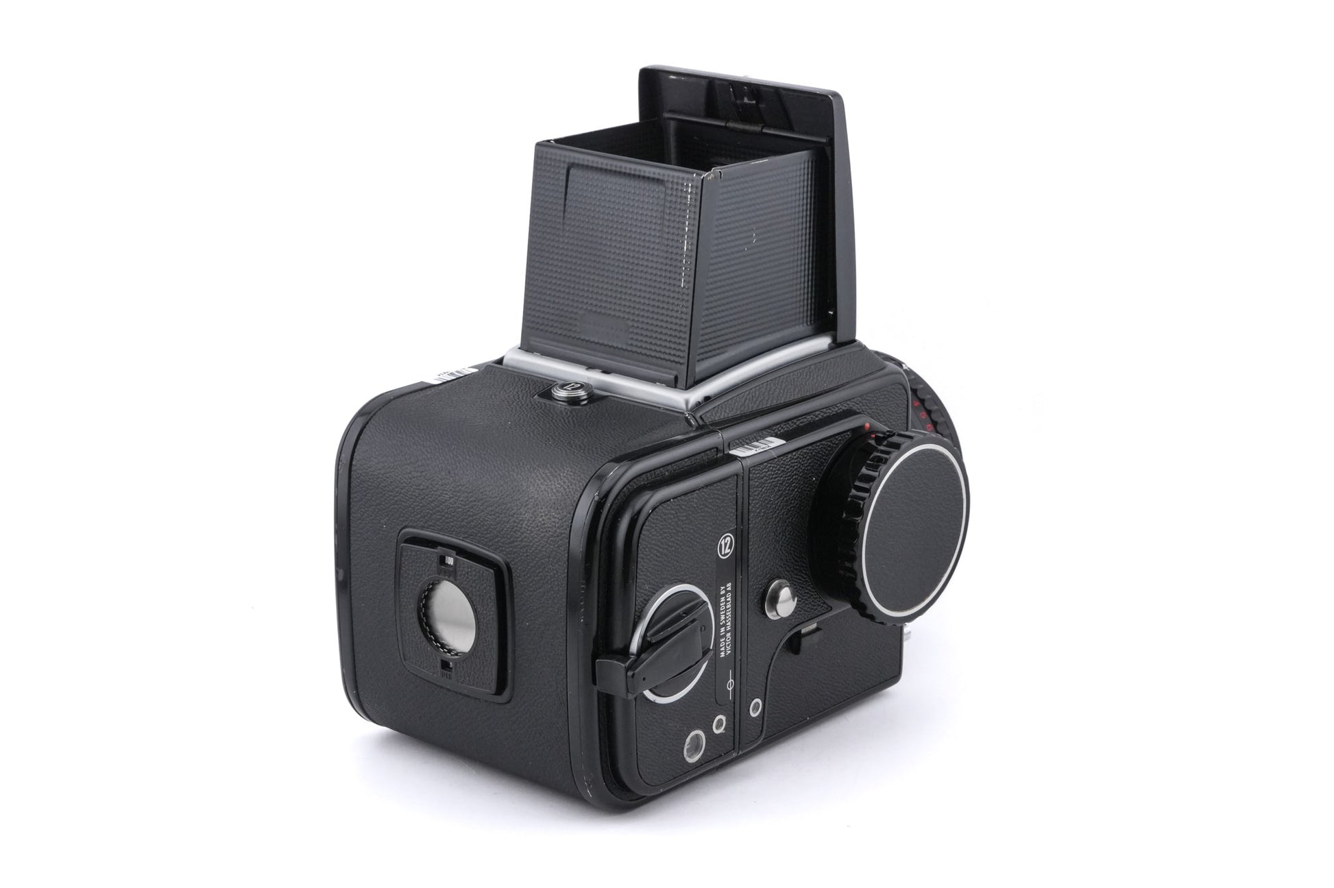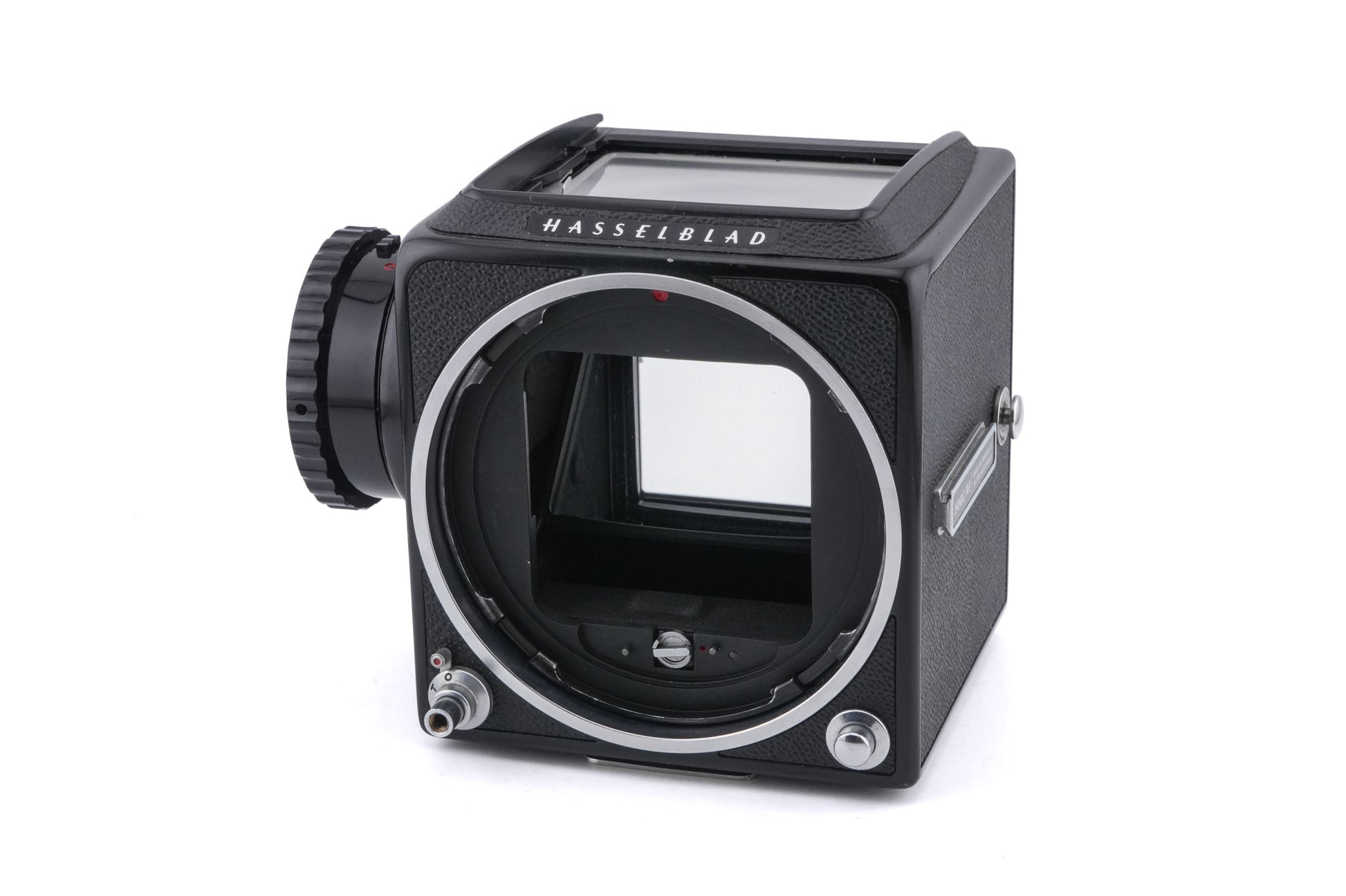 Manual focus V series 120 SLR camera released by Hasselblad in 1970. Its major improvement over the 500C was the addition of a user-interchangeable focusing screen. It is a system camera with interchangeable lenses, prisms, grips, winders, and film backs. Metal body available in black (10170).