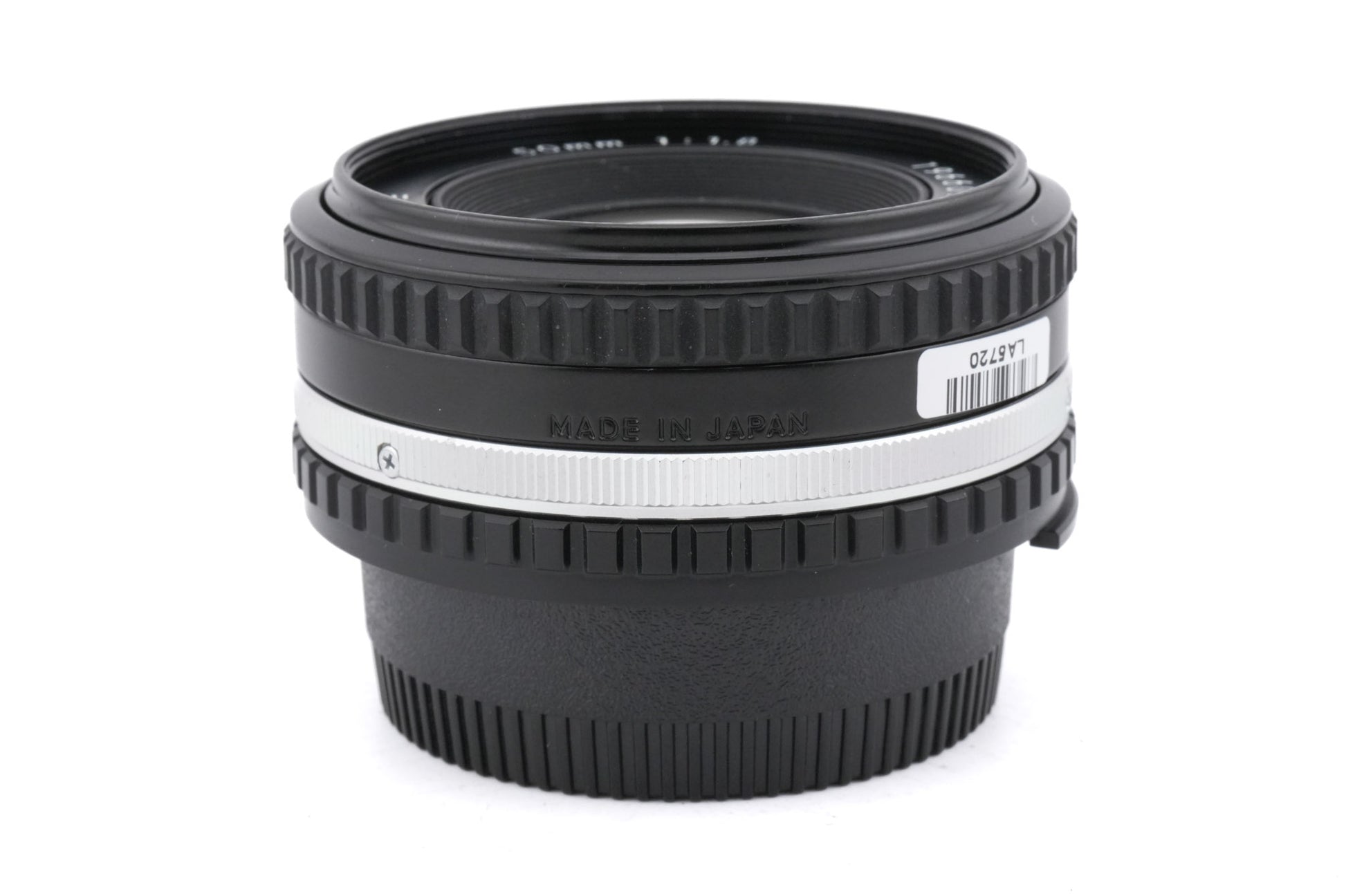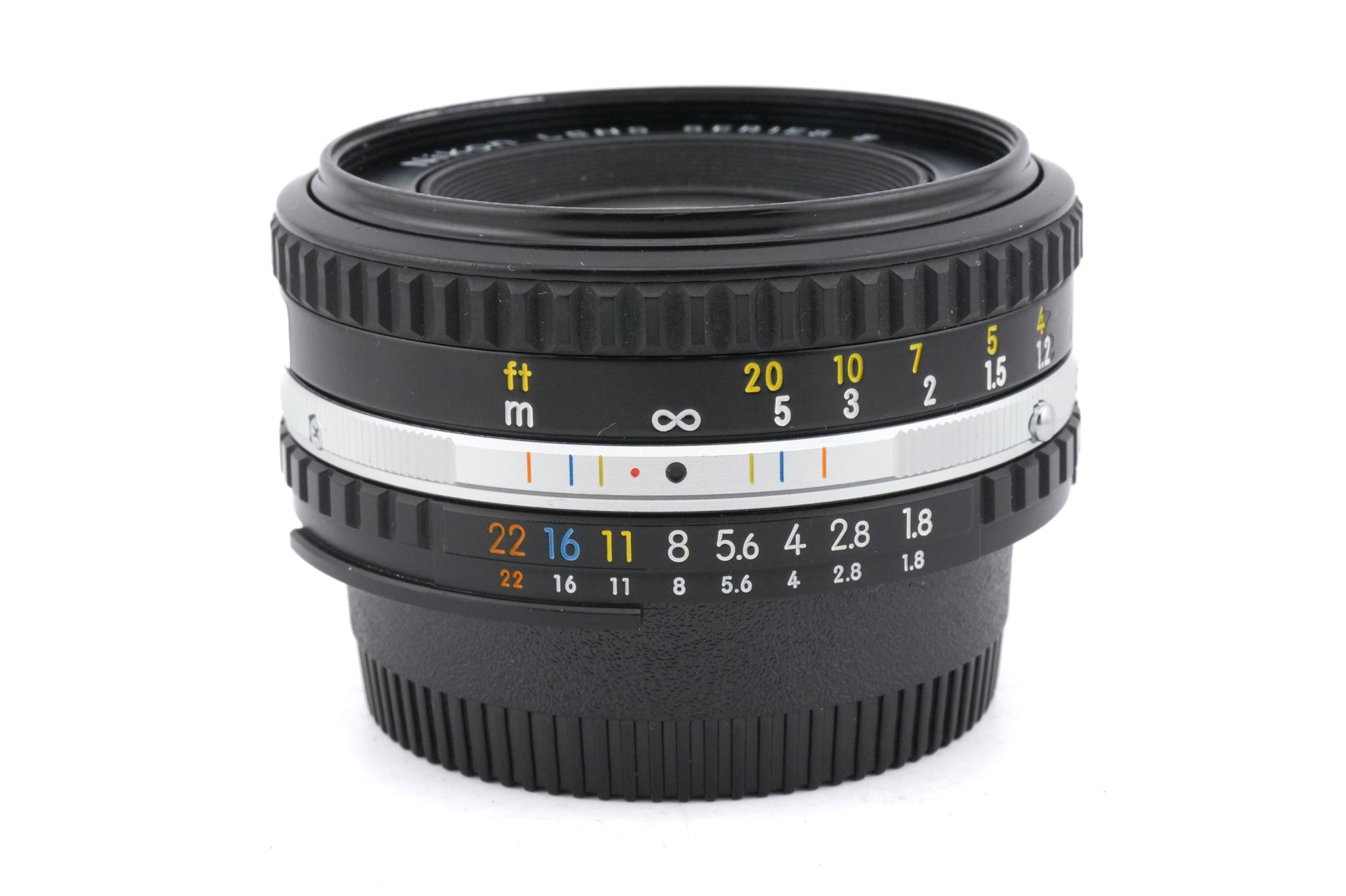 Manual focus normal lens made for F-mount 35mm SLRs by Nikon. It does not have the bunny ear metering prongs but does have the AI ridge and AI-S indent, so it will meter properly on nearly all manual focus Nikon cameras (excluding F, F2, and Nikkormat) and will work with the advanced program modes of later models. Early versions are all black, and later versions have a chrome ring. Metal and plastic body available in black.
