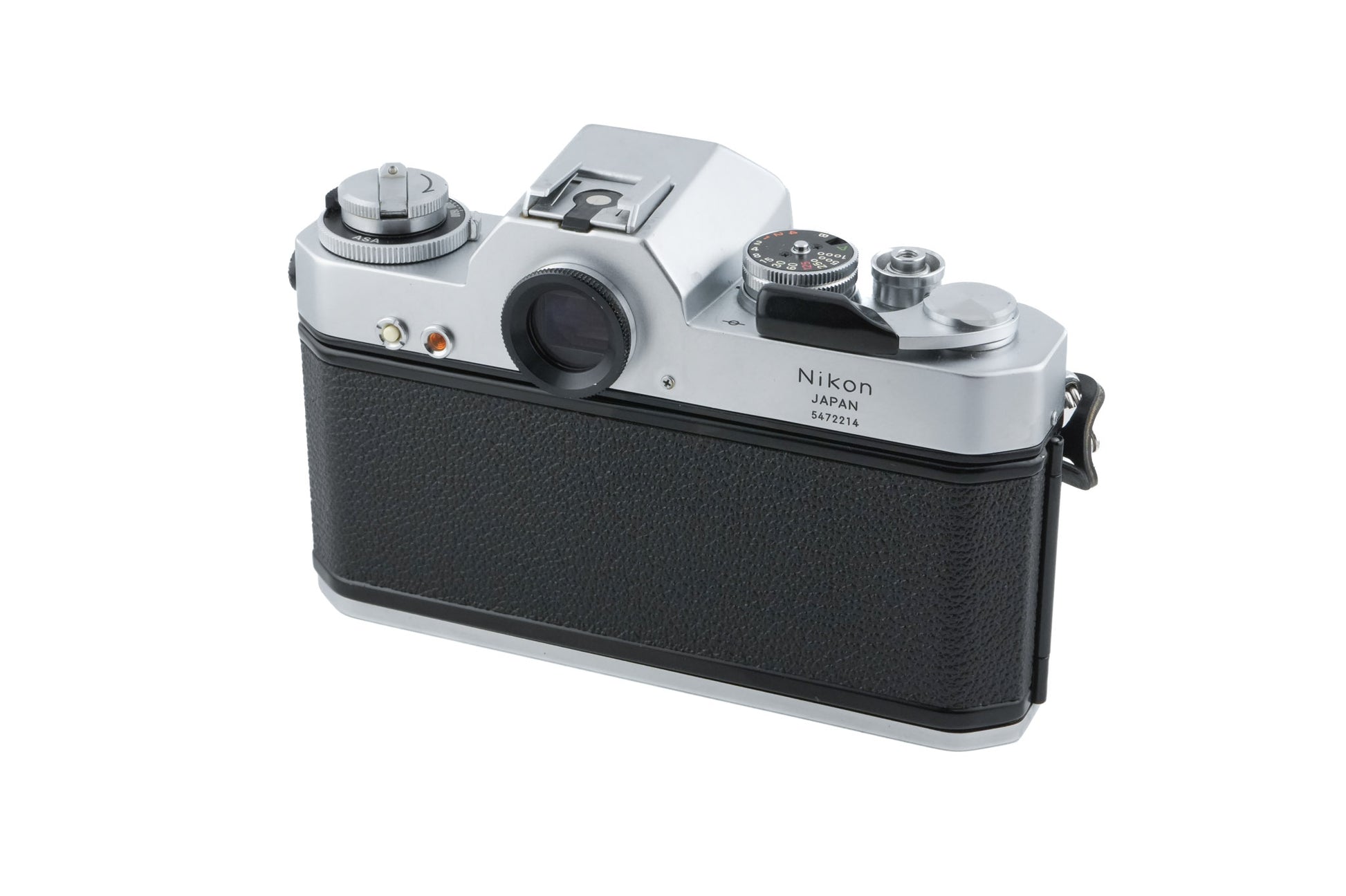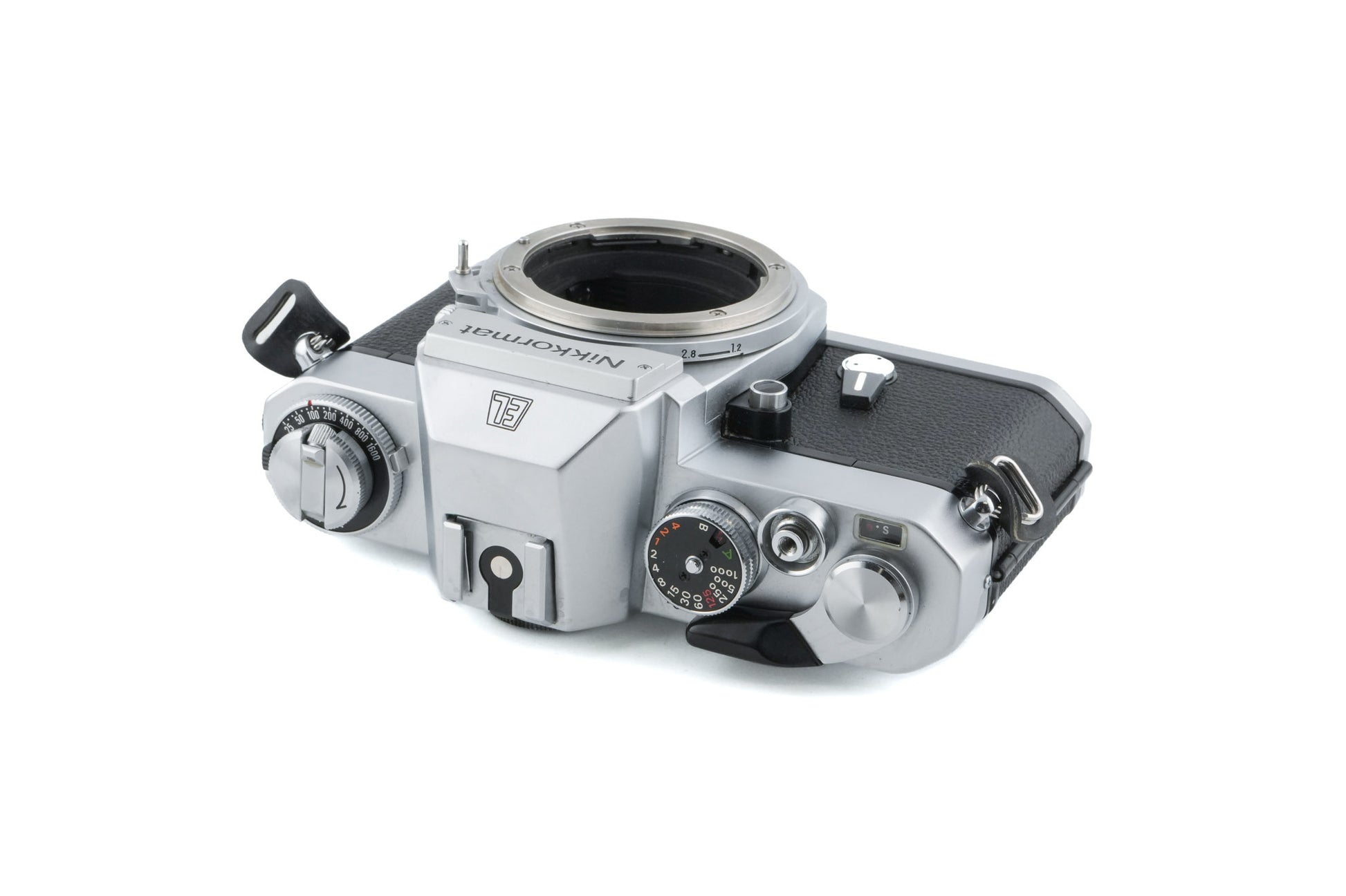 Manual focus 35mm F-mount SLR camera released by Nikon. The battery goes in a compartment underneath the mirror. It will only meter properly with lenses that have bunny ear metering prongs. Metal body available in black & silver.