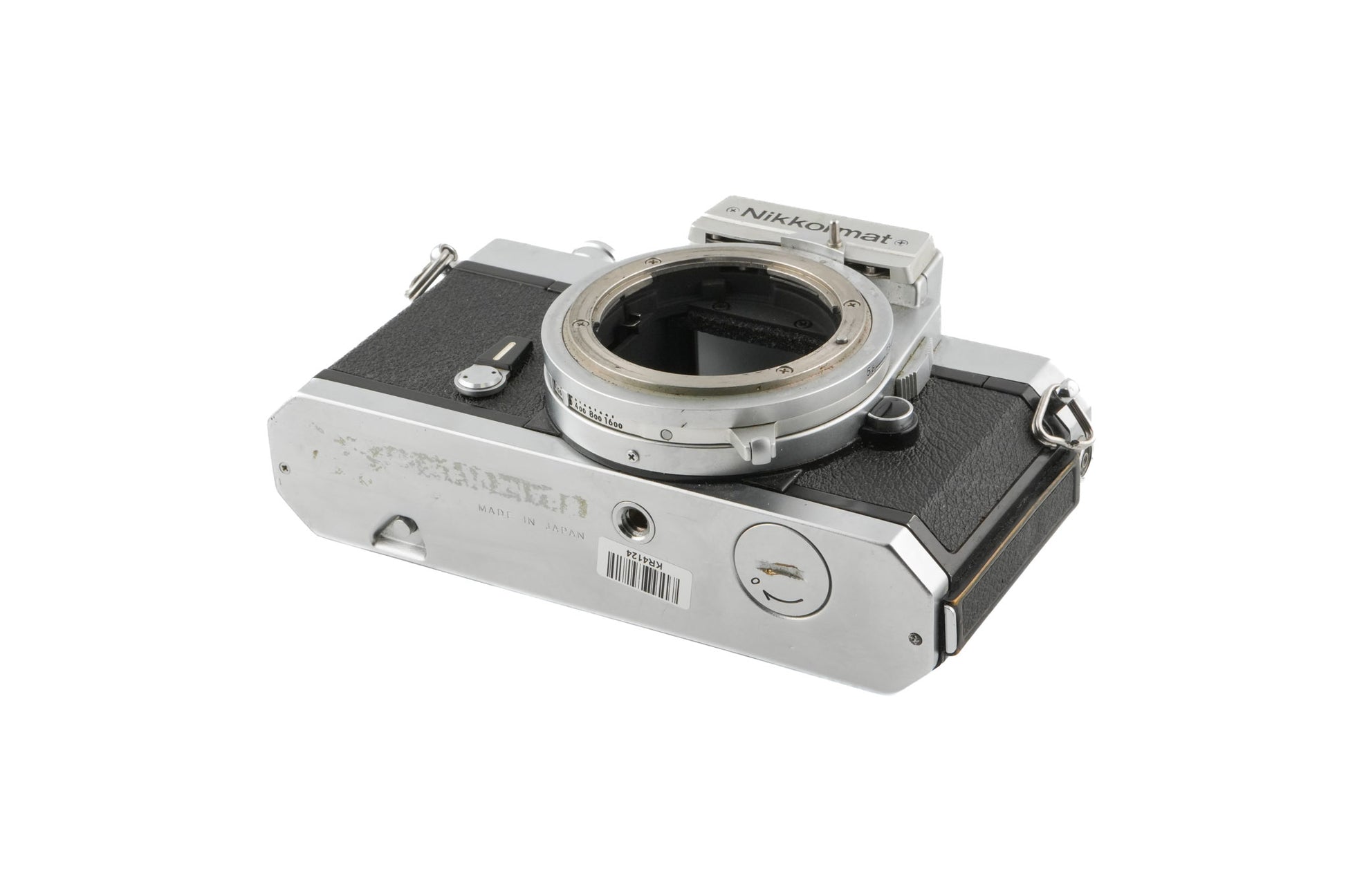 Manual focus F-mount 35mm SLR camera released by Nikon in 1975. This was the final Nikkormat camera to use Nikon's bunny ear metering prongs. It can only meter with lenses that have the prongs. Metal body available in black & silver.