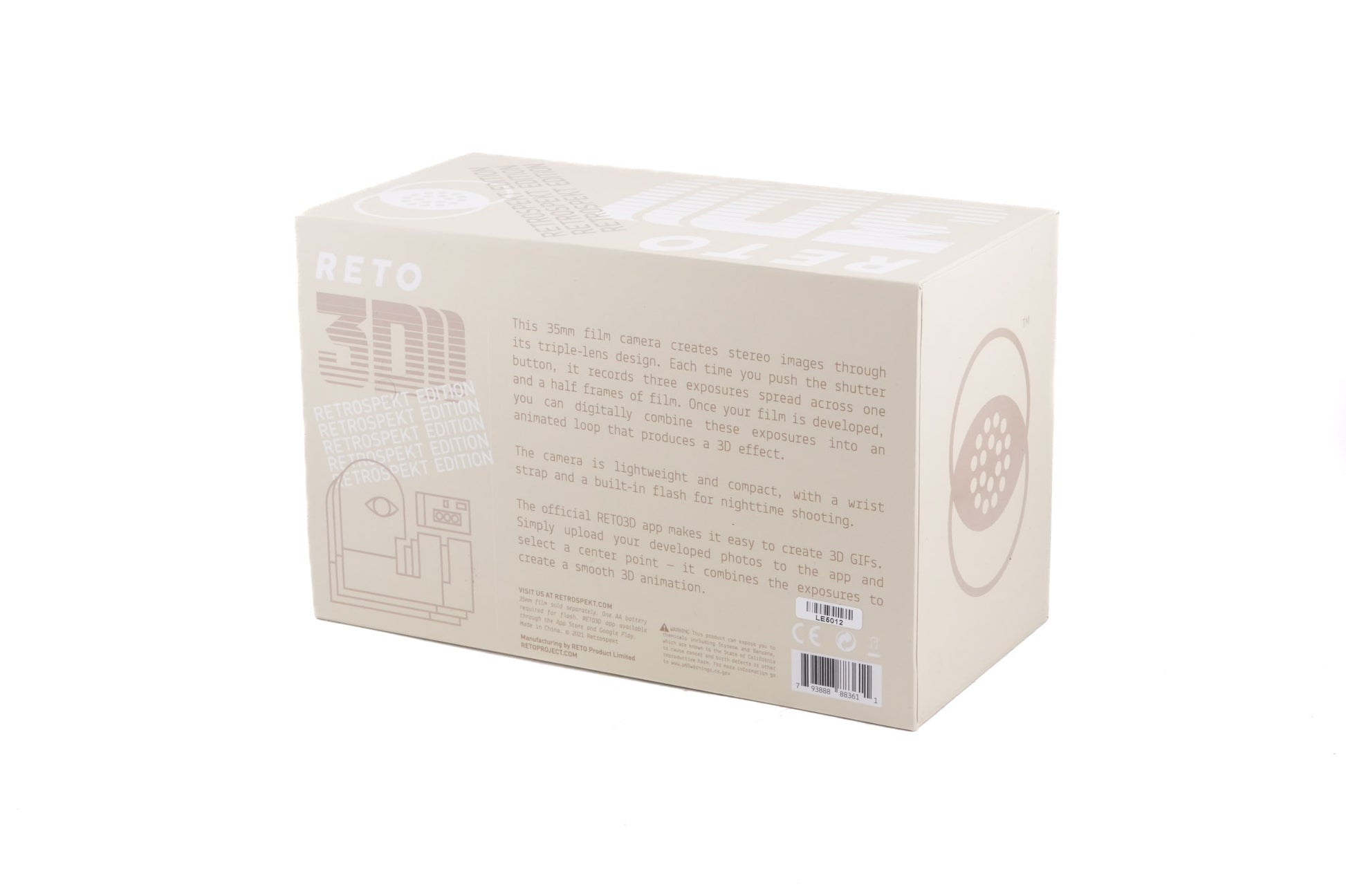 Fixed focus triple-lens 35mm camera released by Reto. It's meant to be used alongside their companion app to make GIFs with a "wiggle" effect created by the three different perspectives of the same scene. This is a special edition produced for Retrospekt in the US. Plastic body available in beige.