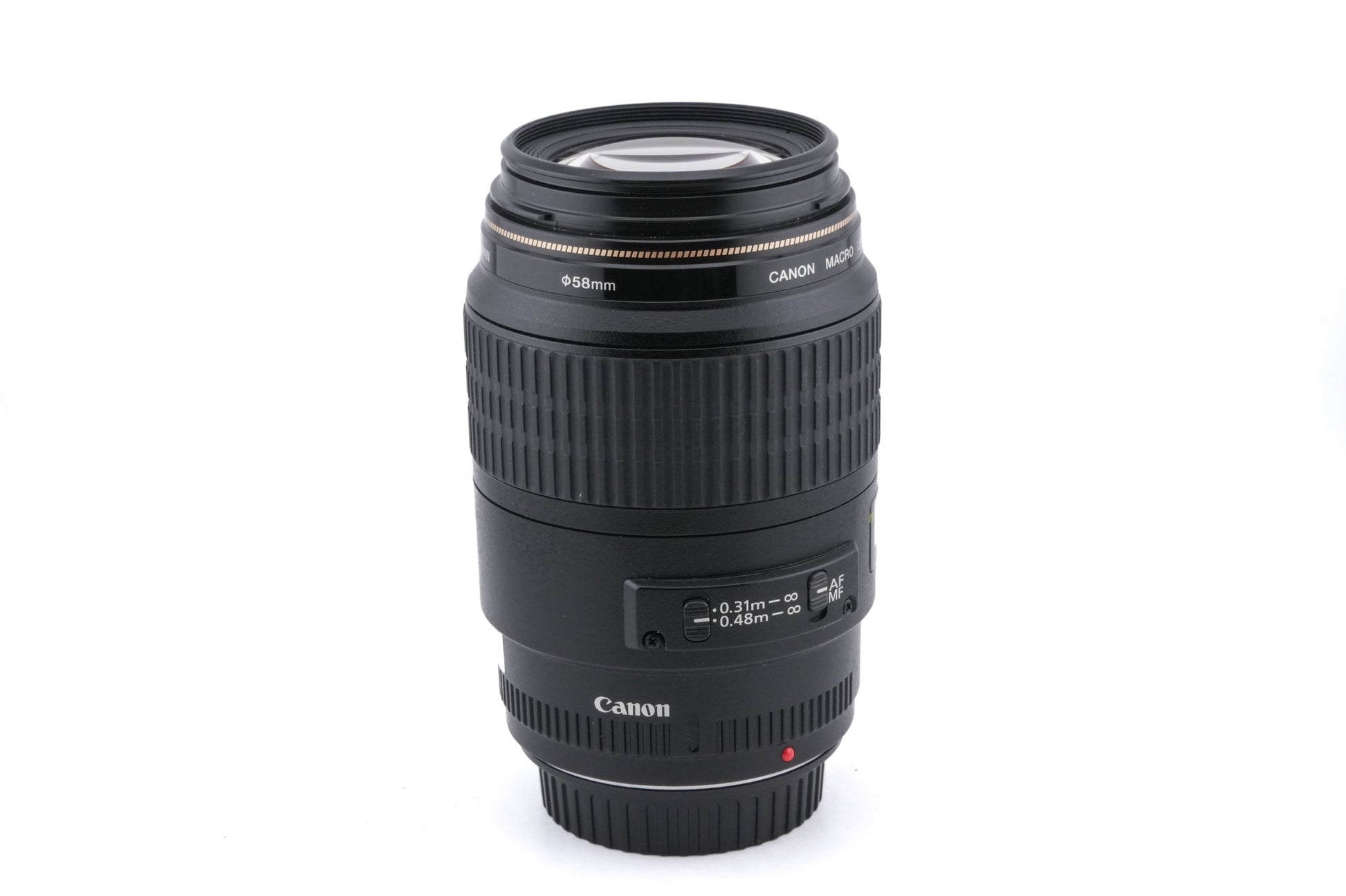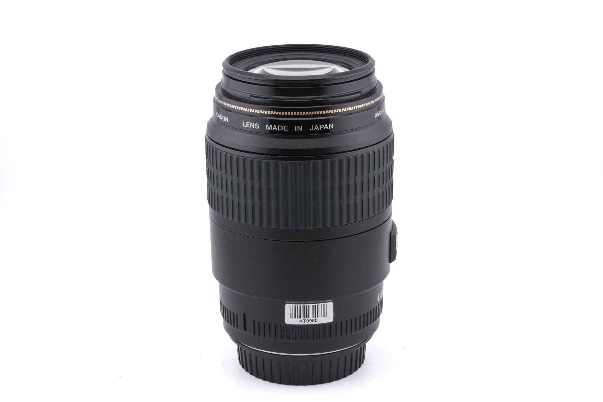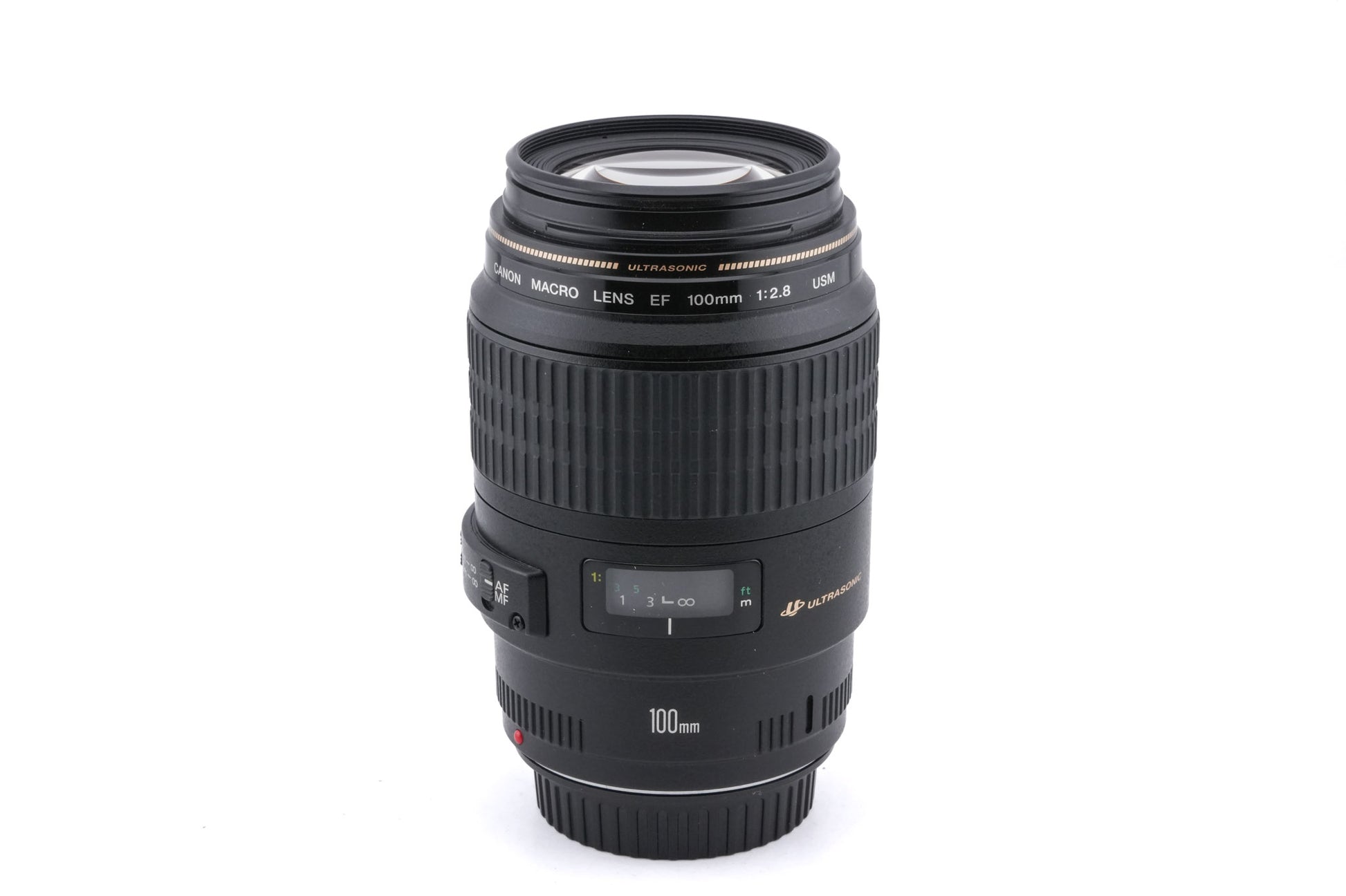 Autofocus telephoto macro lens made for EF-mount SLR cameras by Canon starting in 2000. It is capable of 1:1 macro reproduction and uses Canon's Ultrasonic Focusing Motor (USM) for autofocus. Plastic and metal body available in black.