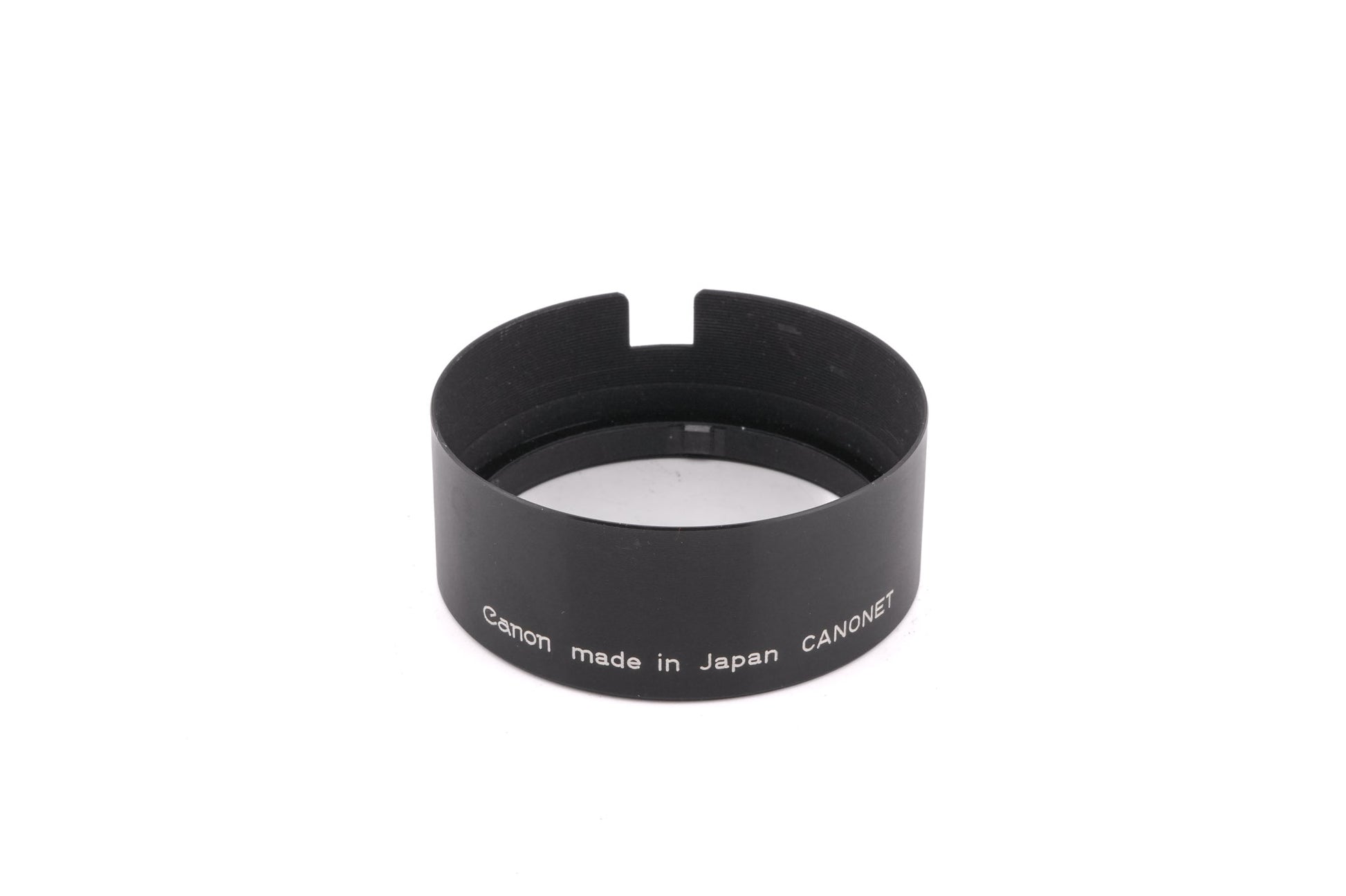Lens hood made by Canon for older Canonet models. It has a cutout so it doesn't block the viewfinder as much. Metal body available in black.