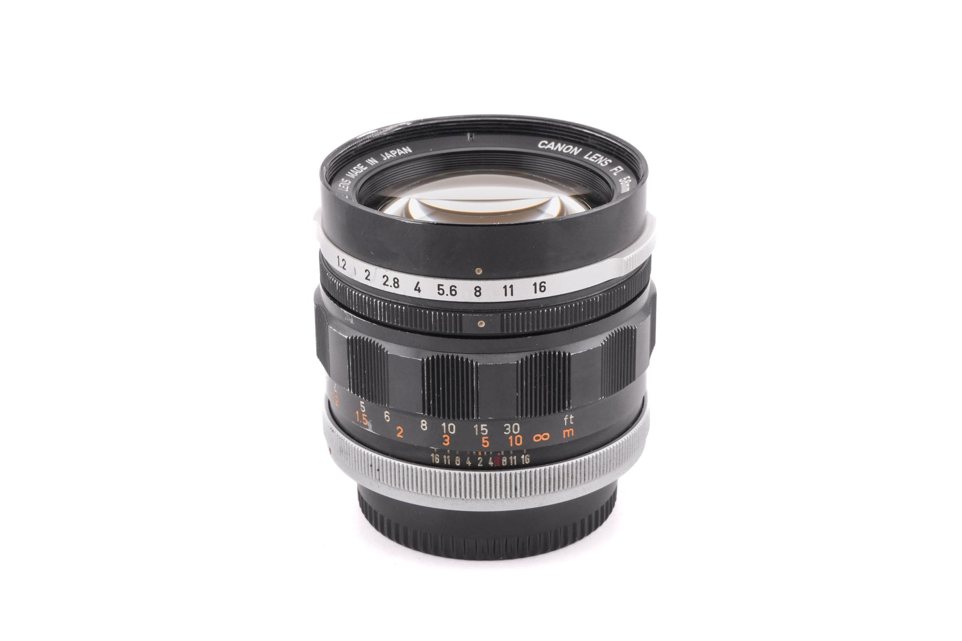 Manual focus standard lens made for FL-mount 35mm SLR cameras introduced by Canon in 1962. Metal body available in black.