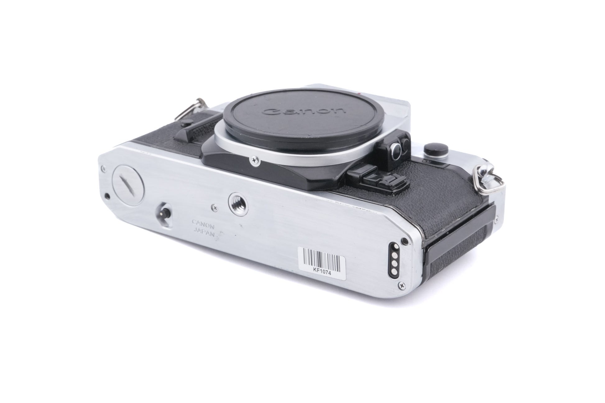 Manual focus FD-mount 35mm SLR released by Canon in 1981. The camera’s main advantage over the AE-1 is access to full program mode. In this mode, the camera will set both aperture and shutter speed automatically based on the lighting condition. The original price (60,000 Yen) is the equivalent of around 525 Euros in 2023. Metal body available in black & silver.