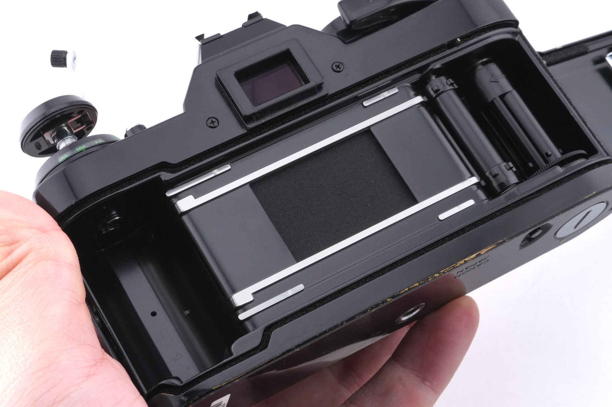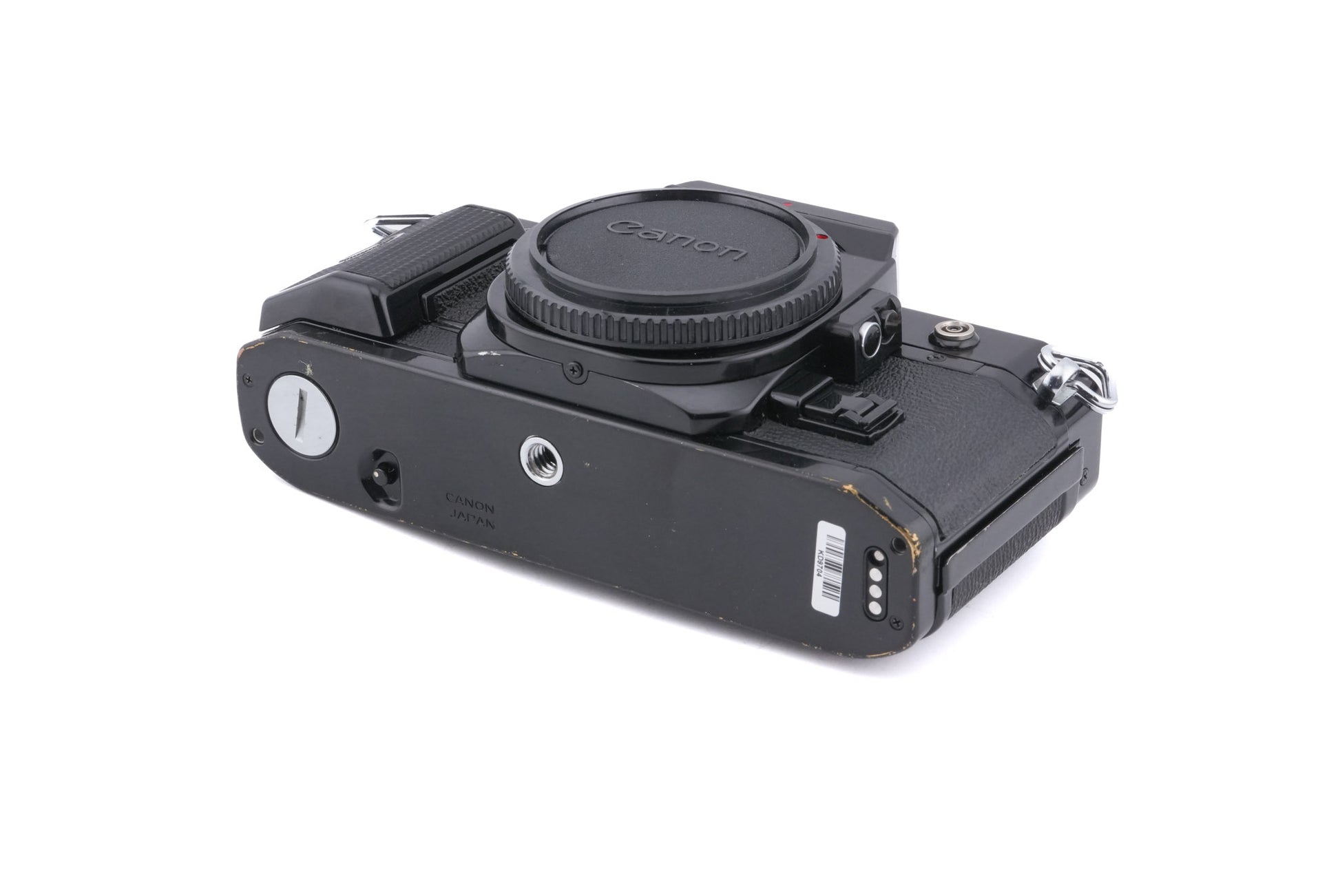Manual focus FD-mount 35mm SLR released by Canon in 1981. The camera’s main advantage over the AE-1 is access to full program mode. In this mode, the camera will set both aperture and shutter speed automatically based on the lighting condition. The original price (60,000 Yen) is the equivalent of around 525 Euros in 2023. Metal body available in black & silver.