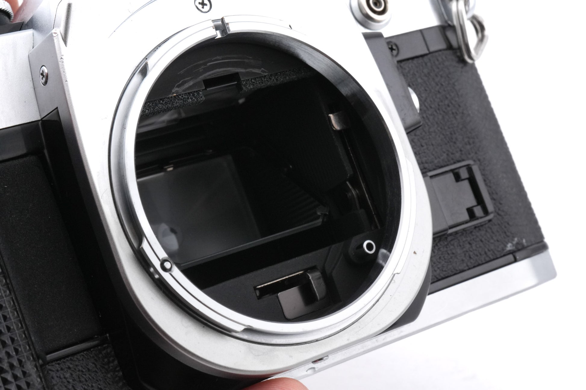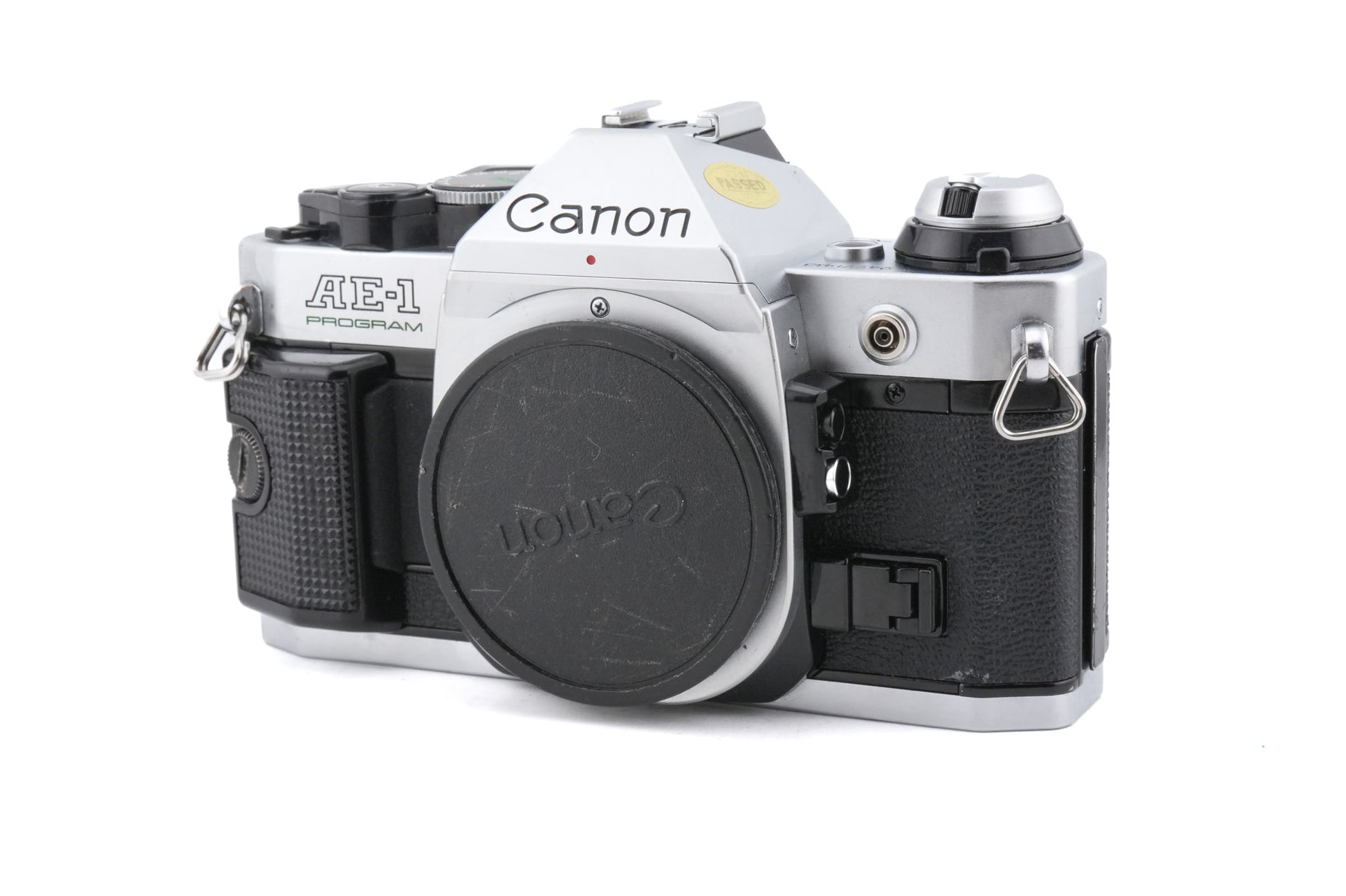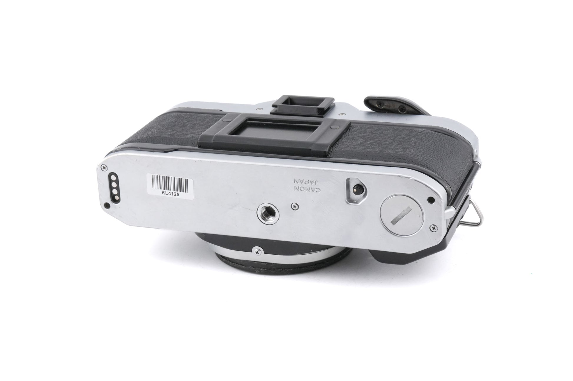 Manual focus FD-mount 35mm SLR released by Canon in 1981. The camera’s main advantage over the AE-1 is access to full program mode. In this mode, the camera will set both aperture and shutter speed automatically based on the lighting condition. The original price (60,000 Yen) is the equivalent of around 525 Euros in 2023. Metal body available in black & silver.