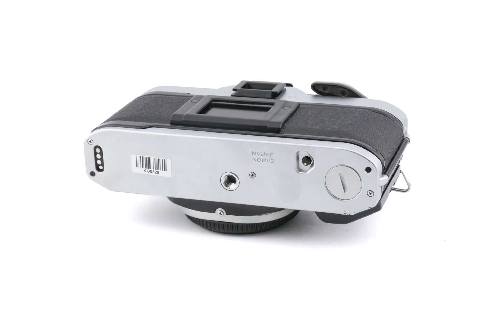 Manual focus FD-mount 35mm SLR released by Canon in 1981. The camera’s main advantage over the AE-1 is access to full program mode. In this mode, the camera will set both aperture and shutter speed automatically based on the lighting condition. The original price (60,000 Yen) is the equivalent of around 525 Euros in 2023. Metal body available in black & silver.