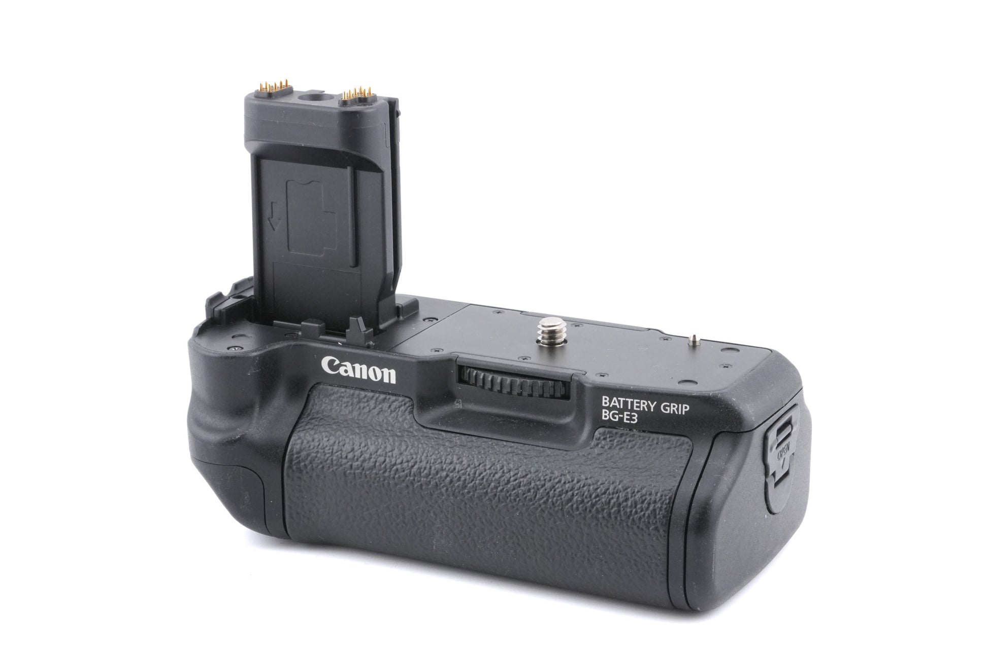 Battery grip made by Canon for Canon EOS 350D and 400D DSLR cameras. It can use either Battery Magazine BGM-E3A for six AA batteries or Battery Magazine BGM-E3L for two NB-2LH batteries. Plastic body available in black.