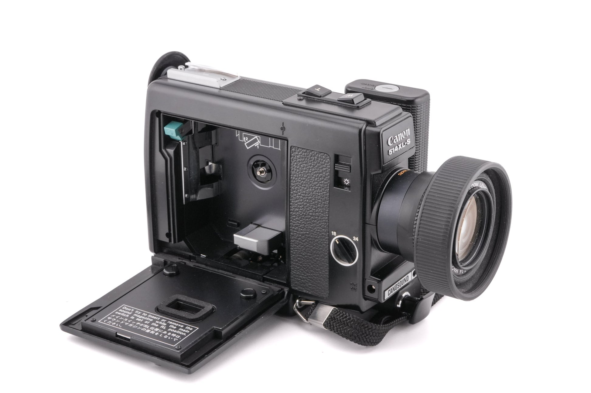 Manual focus Super 8 movie camera introduced by Canon in 1976. It has audio recording with audio level adjustment as well as tone selection. It has both power and manual zooming, a -4 to +2 diopter adjustment, and it folds down into a compact package. It also has a built-in folding rubber hood. Plastic body available in black.