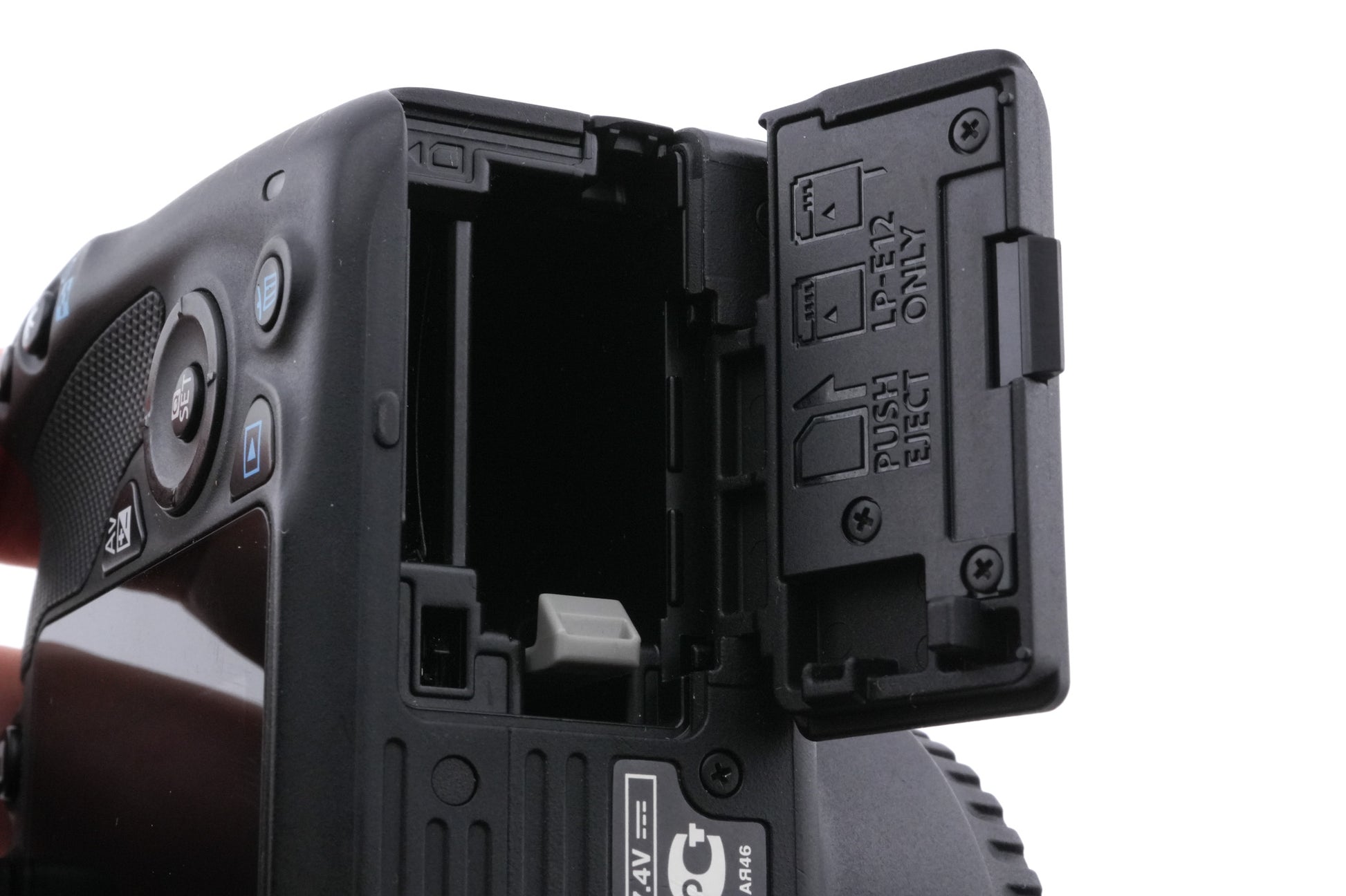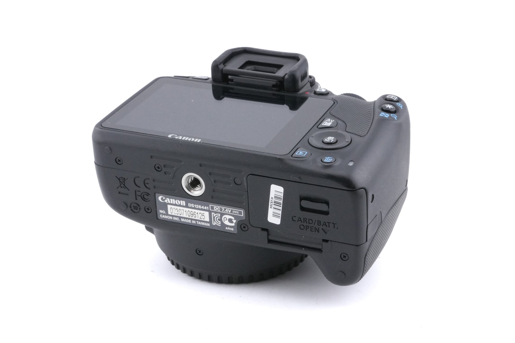 Autofocus EF-S mount DSLR camera released by Canon in 2013. It has a 3" touch LCD, a built-in flash, and 9 autofocus points. Plastic body available in black and white.