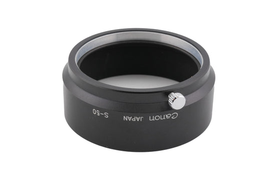 Clamp-on lens hood made for 50mm f1.8 FL and 50mm f1.4 lenses introduced by Canon. Most versions have removable silver bottom rings for using Series filters, but some are just standard clamp-on hoods. It has a 50mm clap mount. Metal body available in black.