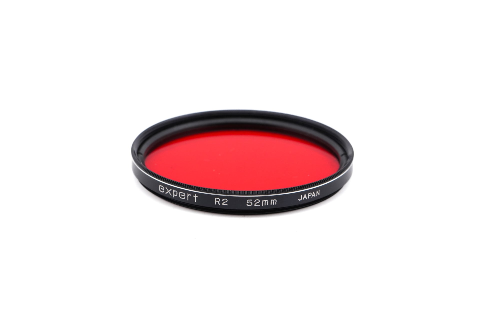 Red color filter for lenses with 52mm filter threads made by Expert. Enhances the contrast in clouds when shooting black and white film. Metal construction available in black.