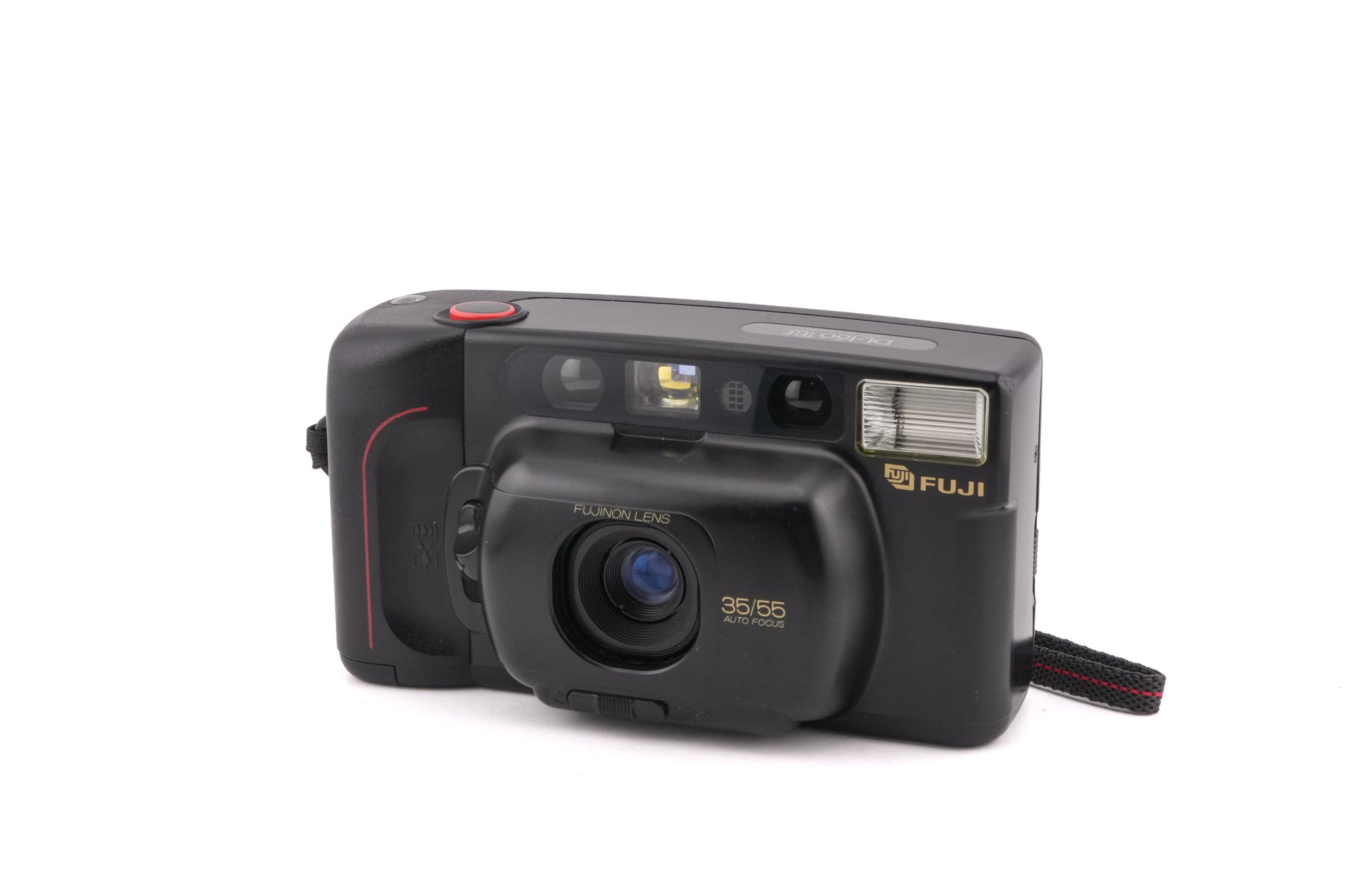Autofocus 35mm point-and-shoot camera introduced by Fuji in 1988. It has a dual lens with 35mm and 55mm focal lengths. It uses Fuji's drop-and-load system. Plastic body available in black.