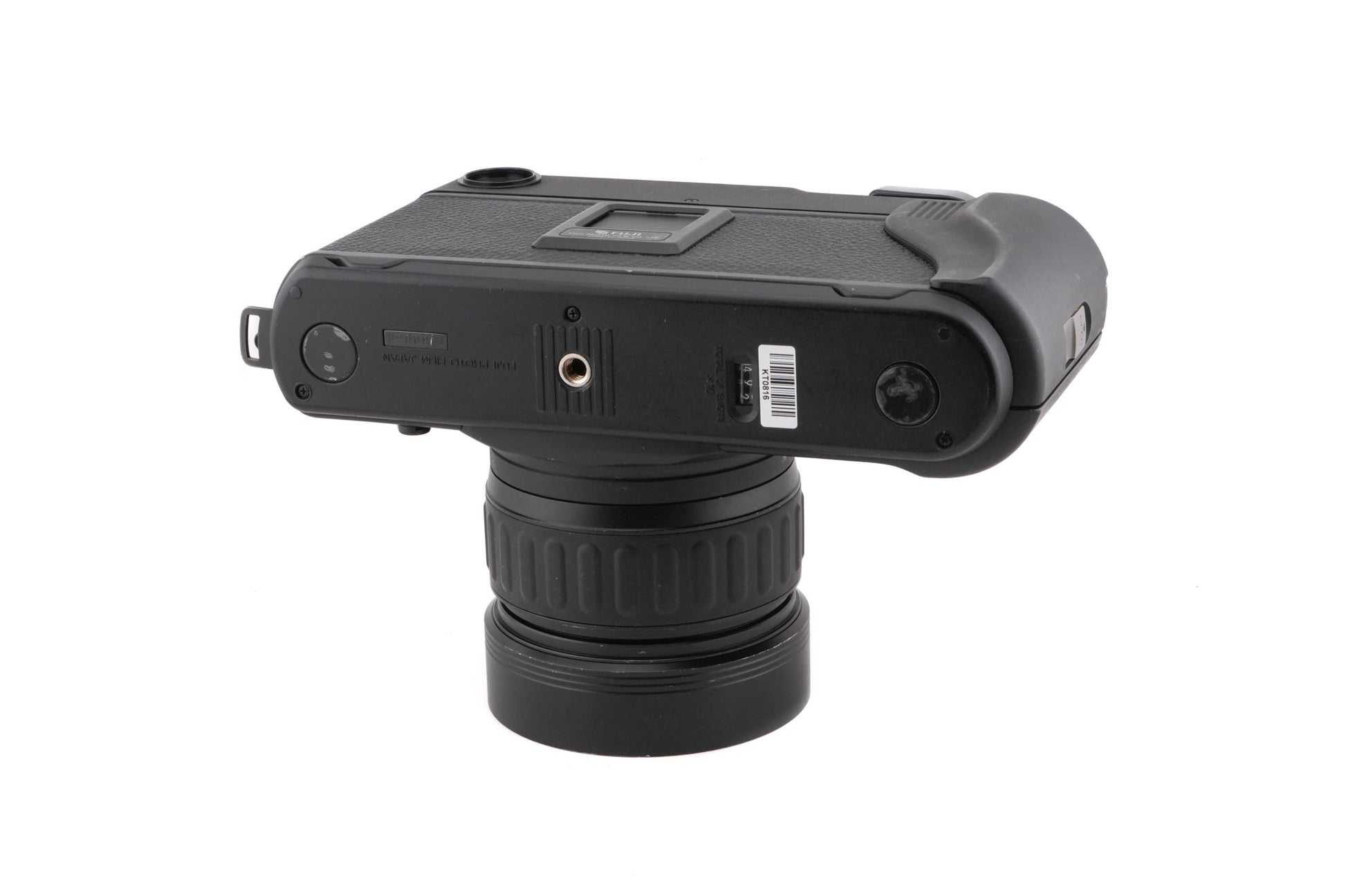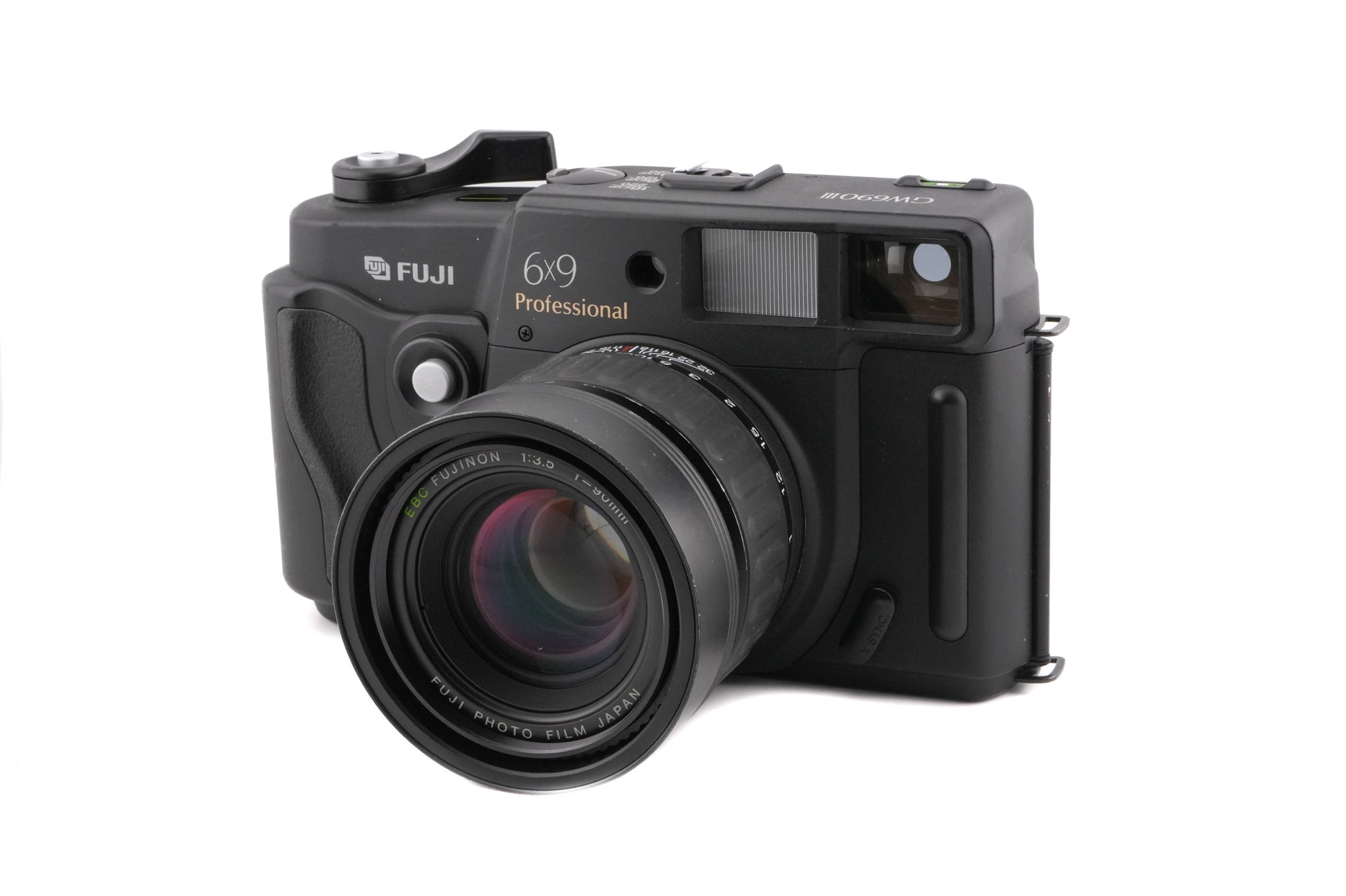 Manual focus 120 rangefinder camera released by Fuji in 1992. This later model added more rounded plastic to the exterior compared to previous models. Has a format selector dial and a built-in lens hood that covers the shutter speed & aperture controls. Also has a shutter count on the bottom. The advance mechanism is double stroke, meaning it requires two pulls on the advance lever. Plastic body available in black.