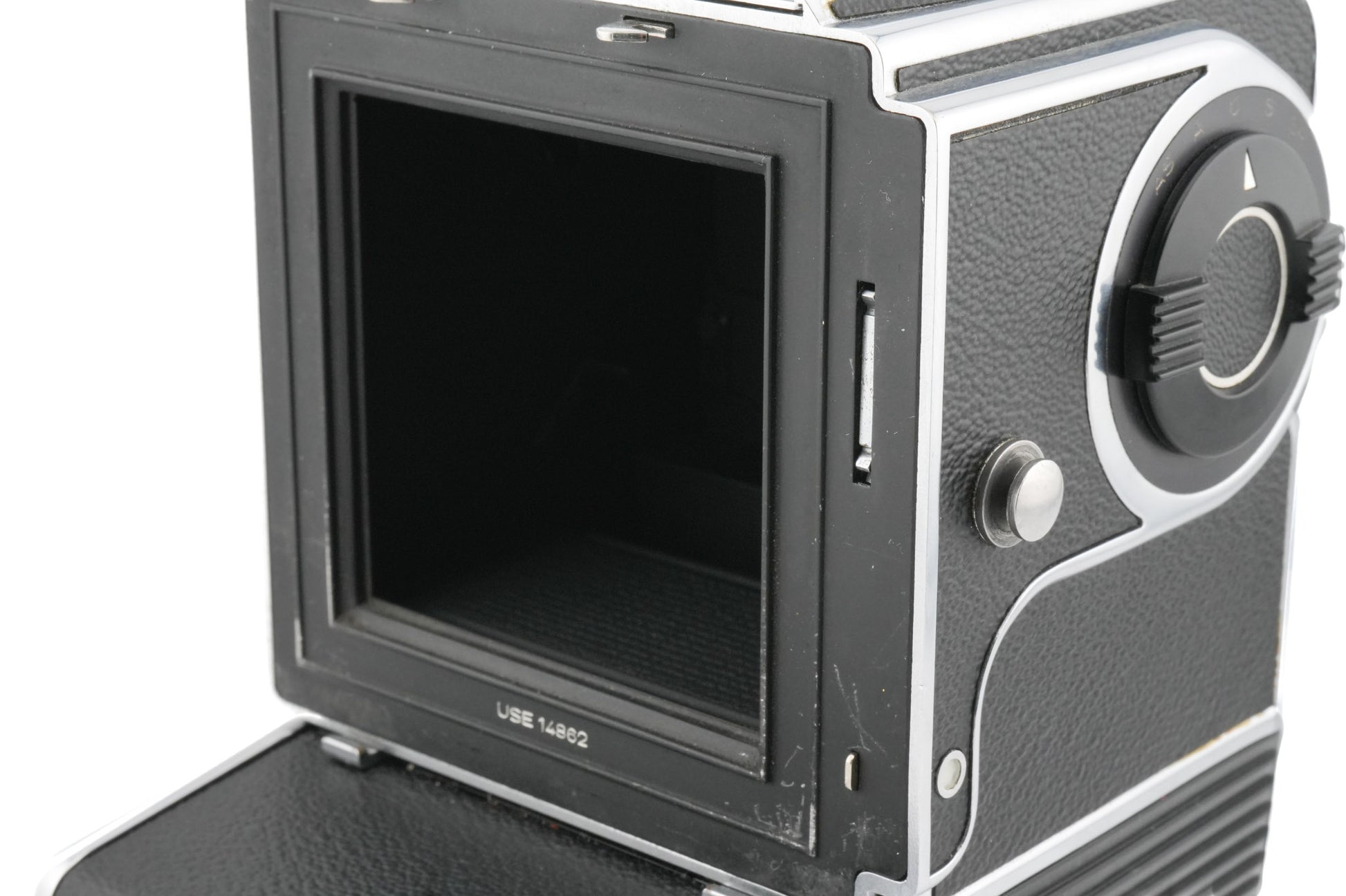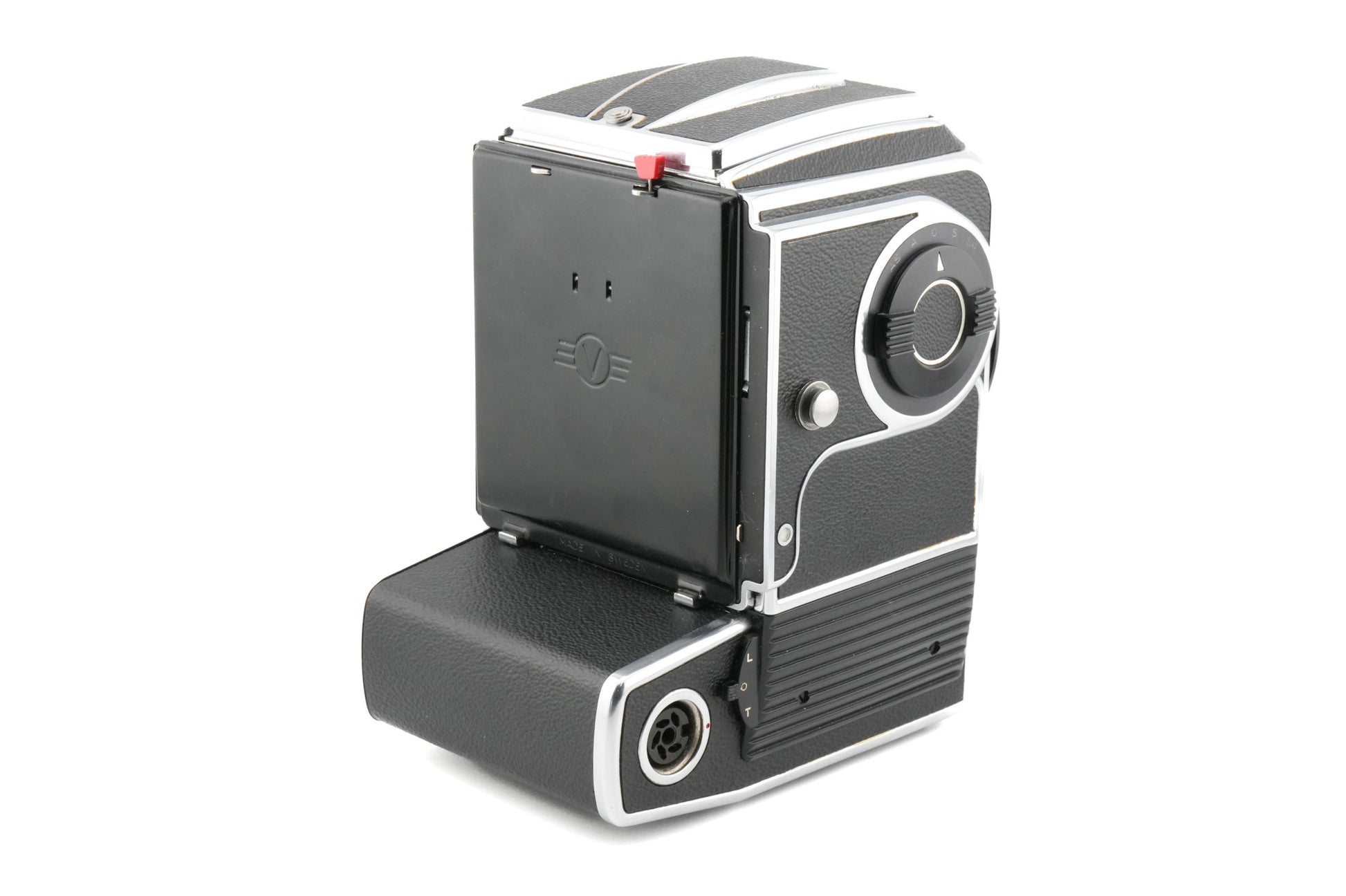 Manual focus V series 120 SLR camera released by Hasselblad in 1965. Although the camera is a completely new design it is, generally speaking, a motorized 500C. The motor allowed the camera to do sequence photography and unattended documentation photography. This was also the camera used by NASA on the Apollo 11 mission to photograph the moon and Earth. The camera uses a unique Ni-Cad battery made up of two 1.2-volt nicad cells connected in a plastic sleeve to deliver 6 volts. Like the 500C, the focusing screen is not user-interchangeable. Metal and plastic body available in silver.
