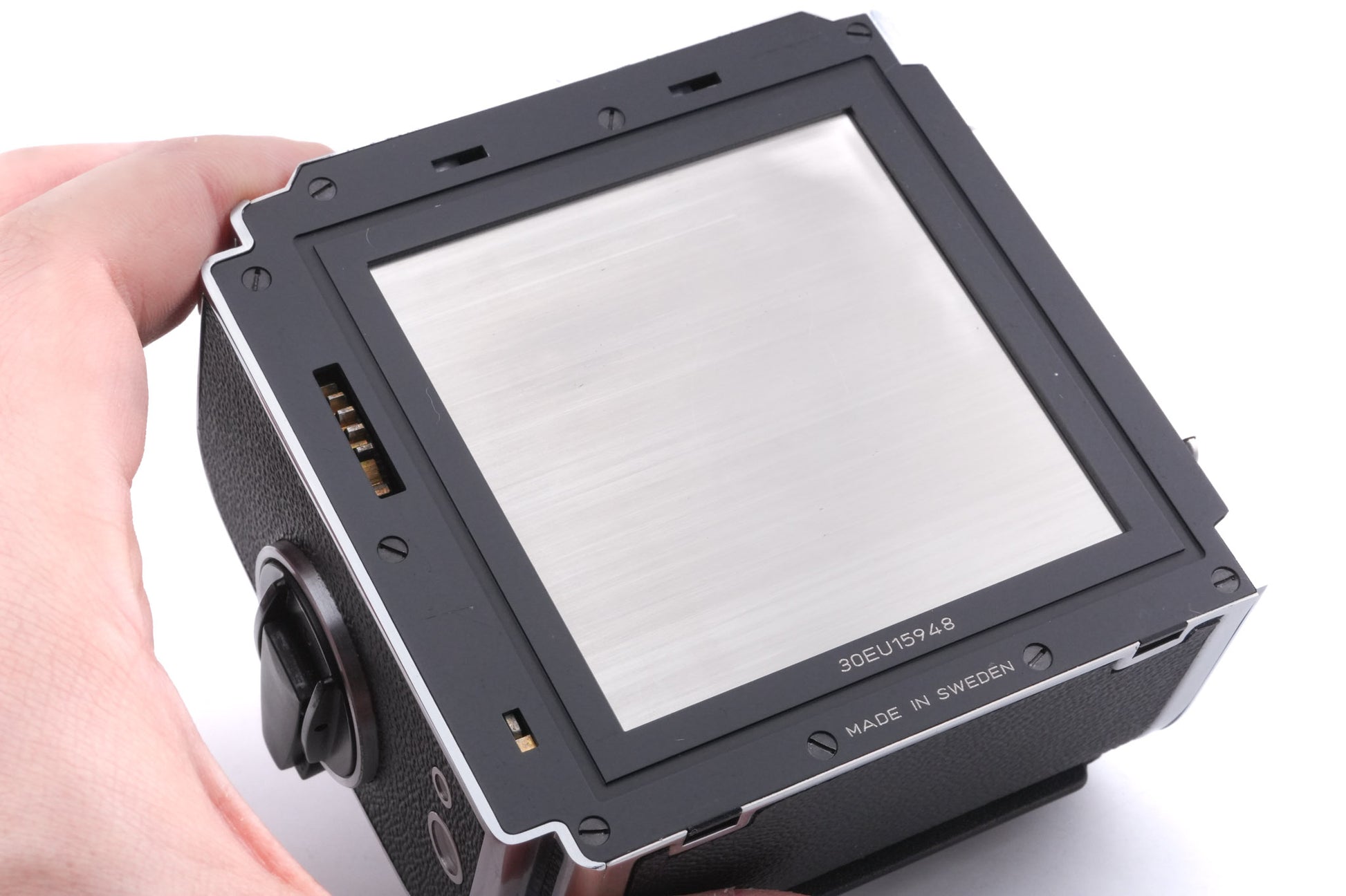 Focusing screen made for V series 120 SLRs by Hasselblad starting in 1989. Like other Acute Matte screens, this one was produced under contract by Minolta. It has a standard four-line crosshair. Metal body available in silver.
