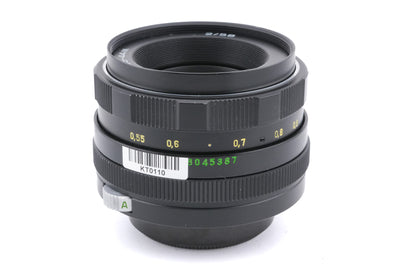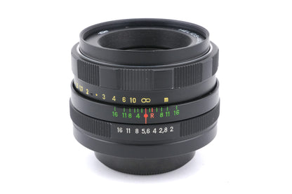 Manual focus normal lens made for M42 mount SLR cameras in the Soviet Union. Many factories made Helios lenses, including KMZ and Valdai. Metal body available in black.