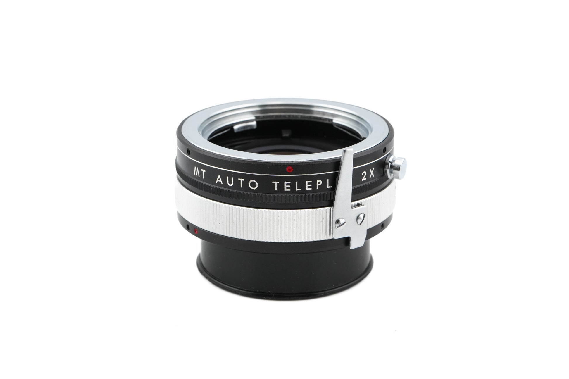 Teleconverter for Minolta MD-mount 35mm SLR's made by Kenko. Multiplies focal length by two at the cost of two stops of light. Metal construction available in black with a chrome ring.
