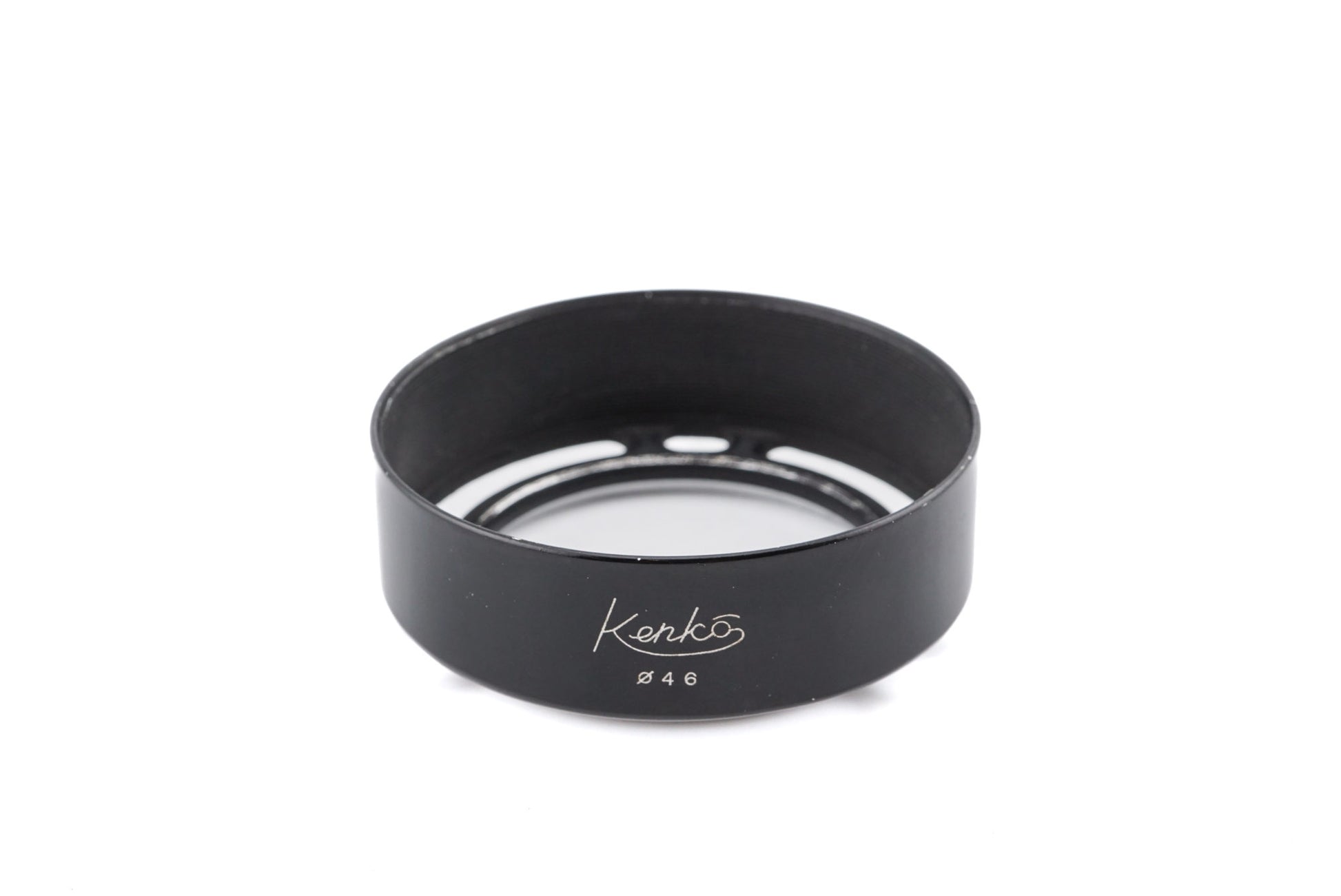 Round lens hood made by Kenko for all lenses with a 46mm filter thread. Metal body available in black.