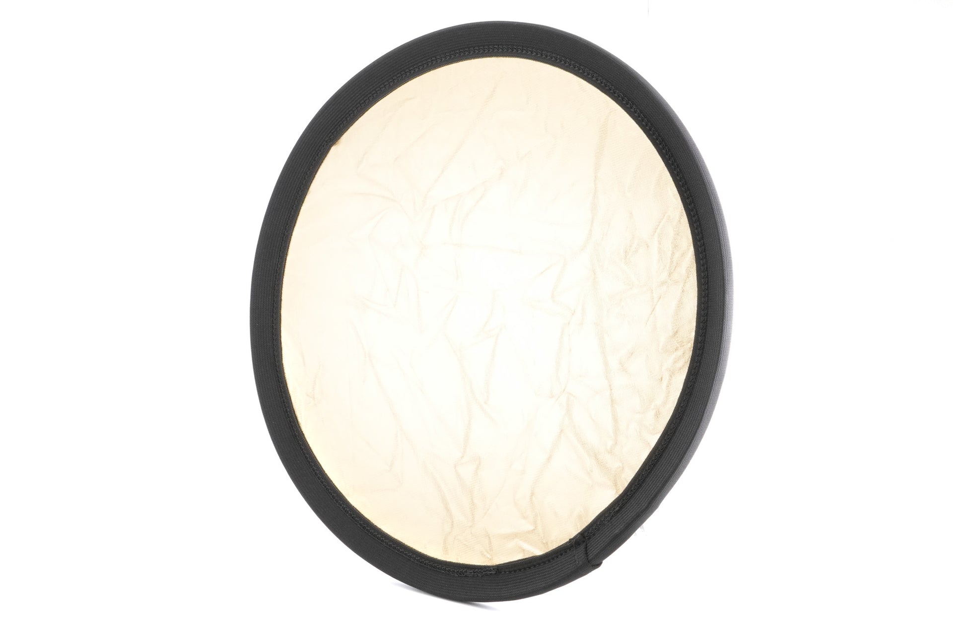 Collapsible reflector made by Lastolite. It features a gold and a silver side. Fabric body available in black/gold/silver.